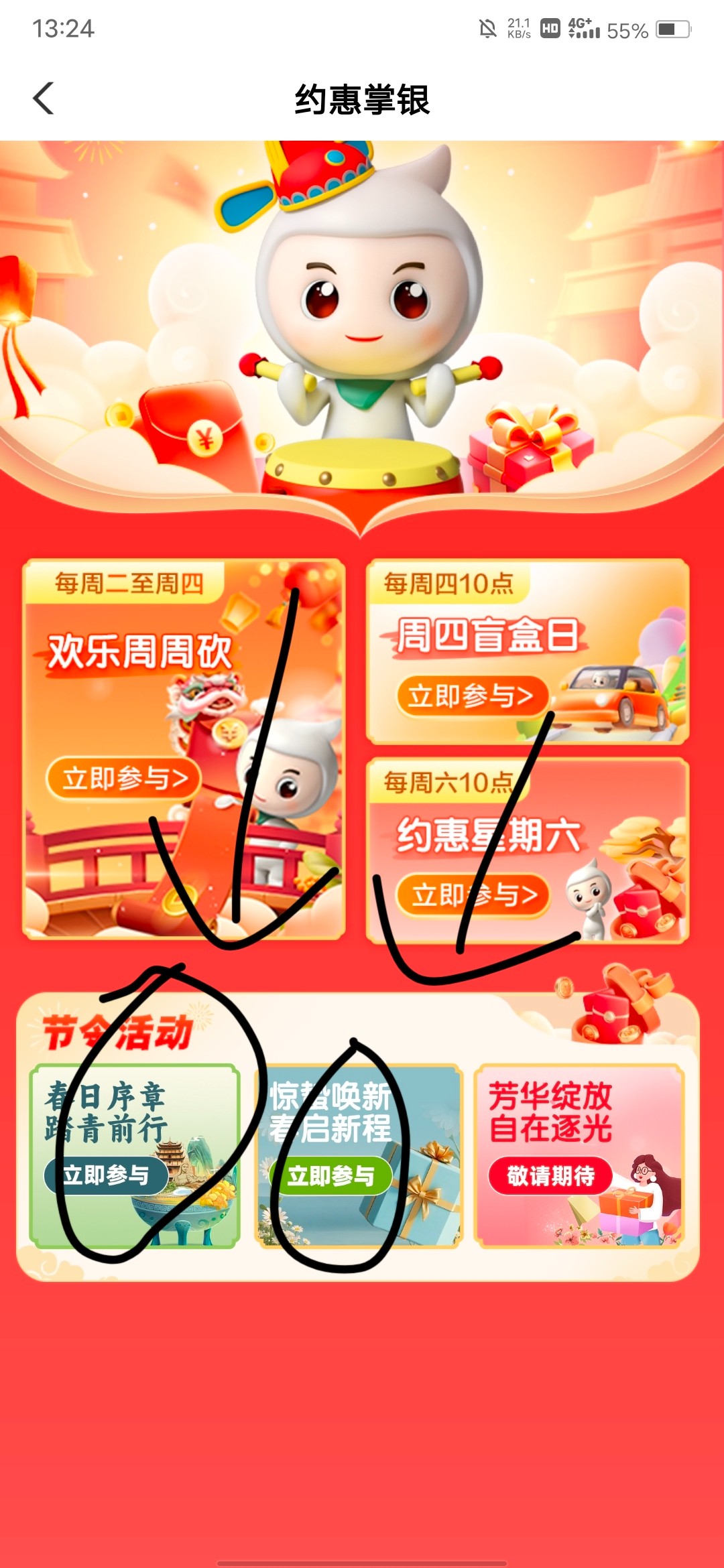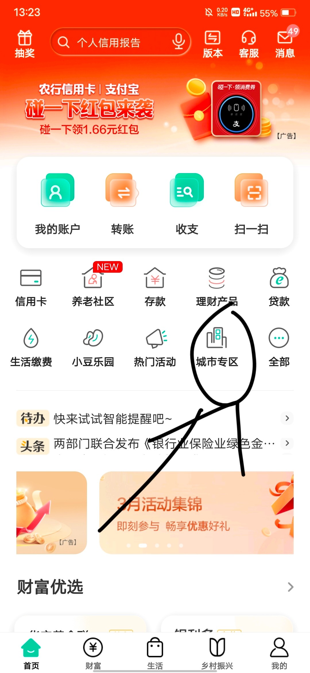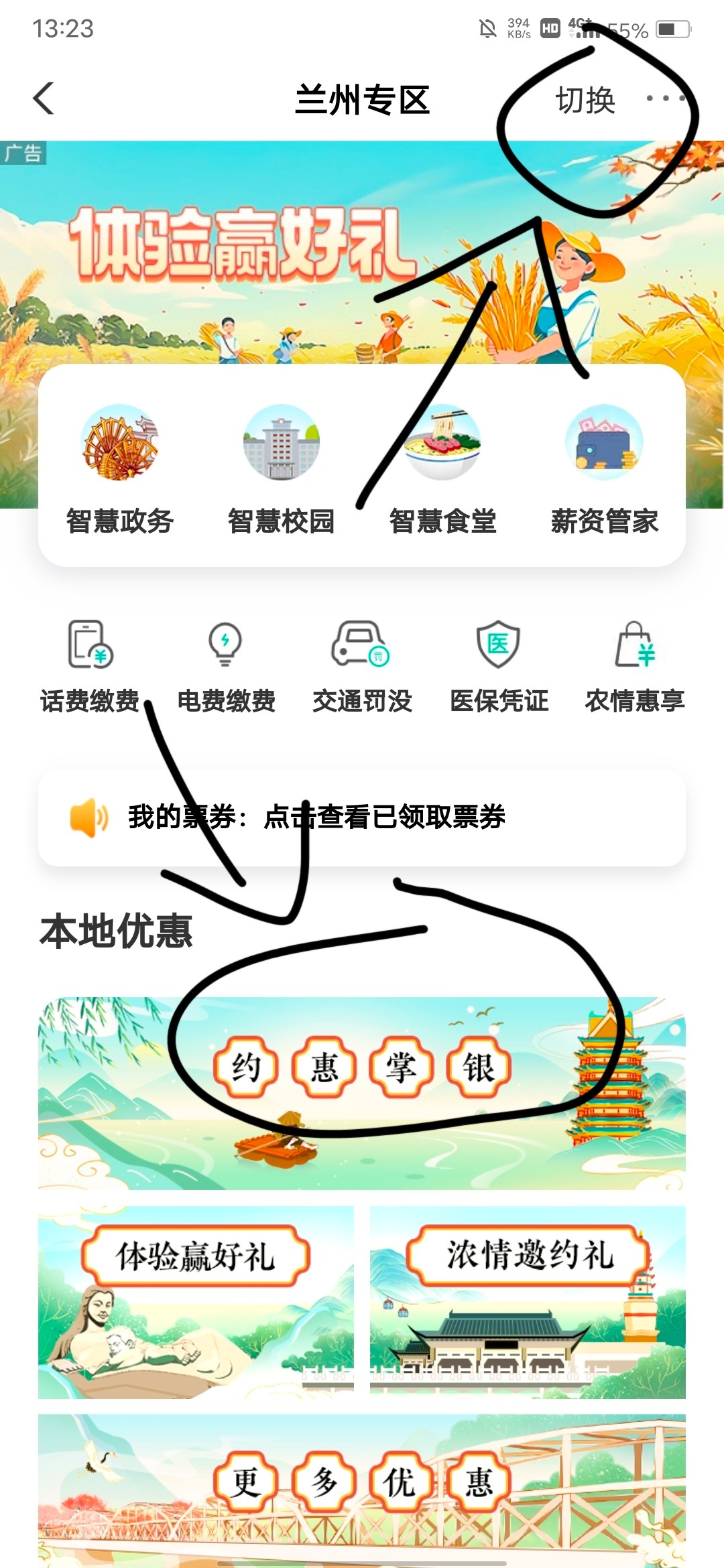 农业银行先注销,然后再重新注册。位置选择甘肃省。选择位置一定要选择甘肃。然后点城市专区,右上角选择兰州。再点那个约惠掌银,几乎人人一张20元的e卡,一张20元的支付宝消费红包。那个淘宝券就是消费红包,填支付宝手机号就行