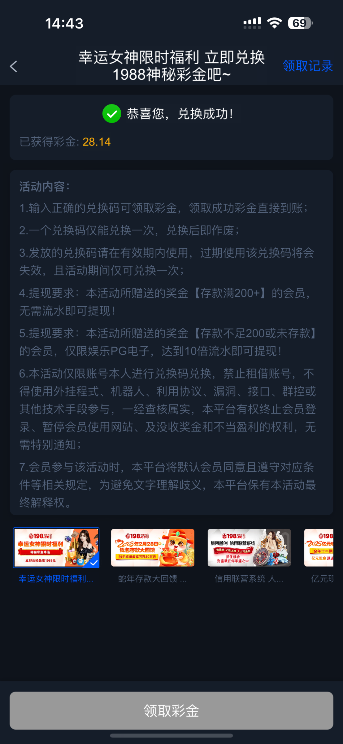 198去碰28元幸运女神彩金 我没有接到电话去碰 然后给了两个兑换码 都是28 没有打出来 你们可以去试一试 198.cc