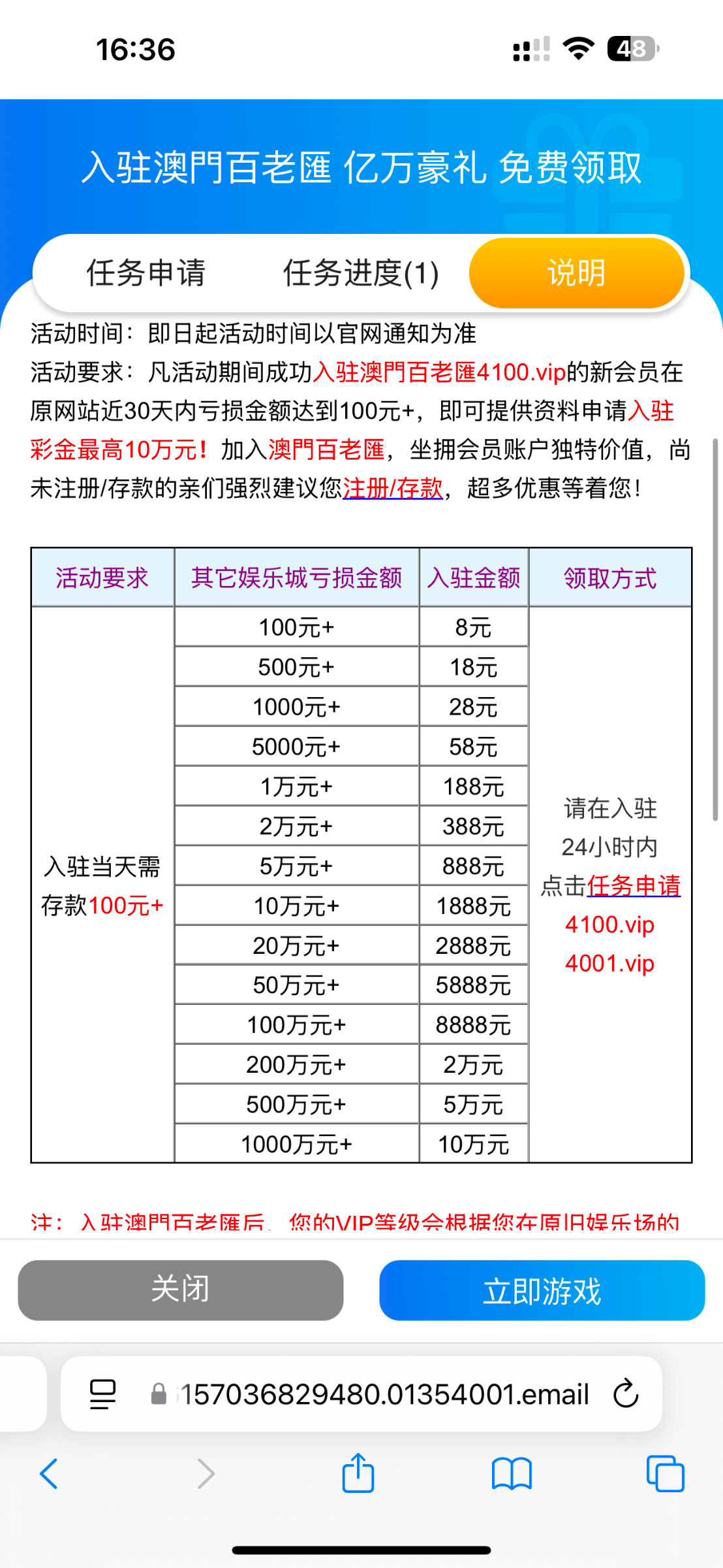 4001.com 百老汇入驻金老哥们可以去嫖它 要充值100拿自己近30天亏损号申请本人有号去改下ip注册了个号 如果百老汇有号的姓名不能用自己的,用自己朋友或者编一个也行 用了自己的会判定套利 提款用自己的收款方式提不查 打不上去没水只提了500 如果有吃上的老哥打个猪脚饭
