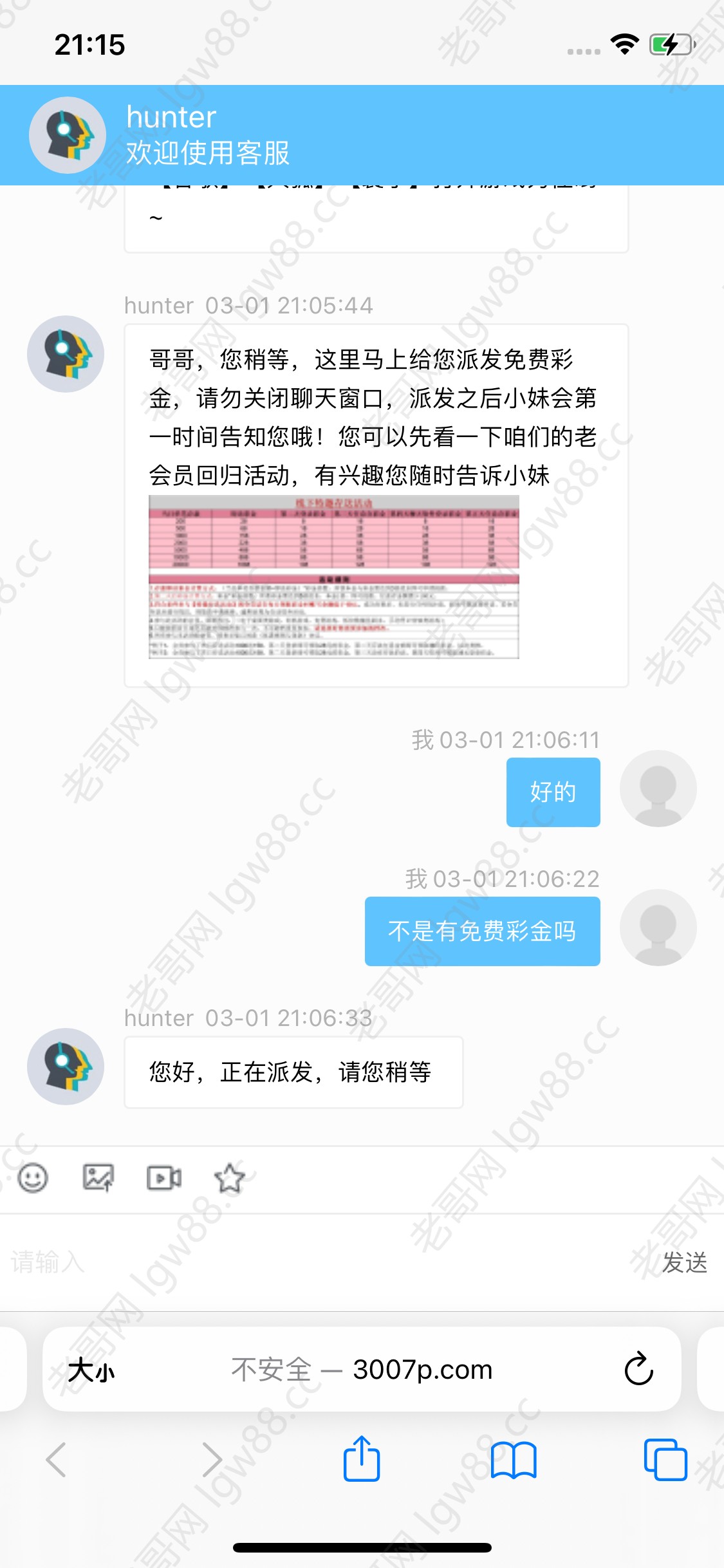 网站http://3007p.com/chat/index.html?id=a3231e09958d493bb0c2d9ff5fe664d7 进去之后发他手机号和名字如果是回访用户直接送彩金