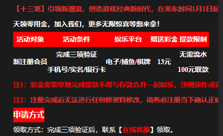 新用户注册绑卡,完善信息。联系在线客服申请13彩金,最低限制100提现,限制电子捕鱼。具体自测!