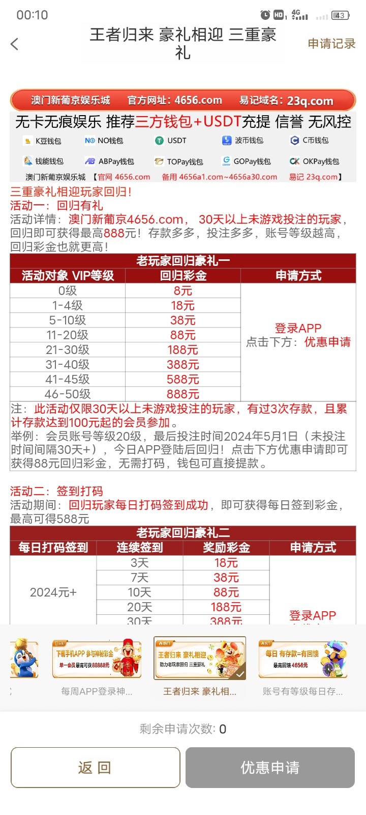 4656.com 老用户充值过100满3次充值记录的去申请彩金