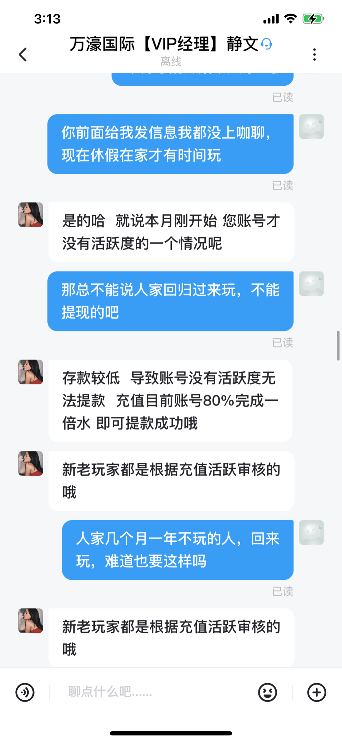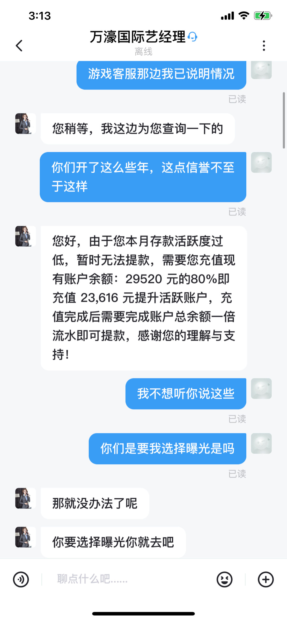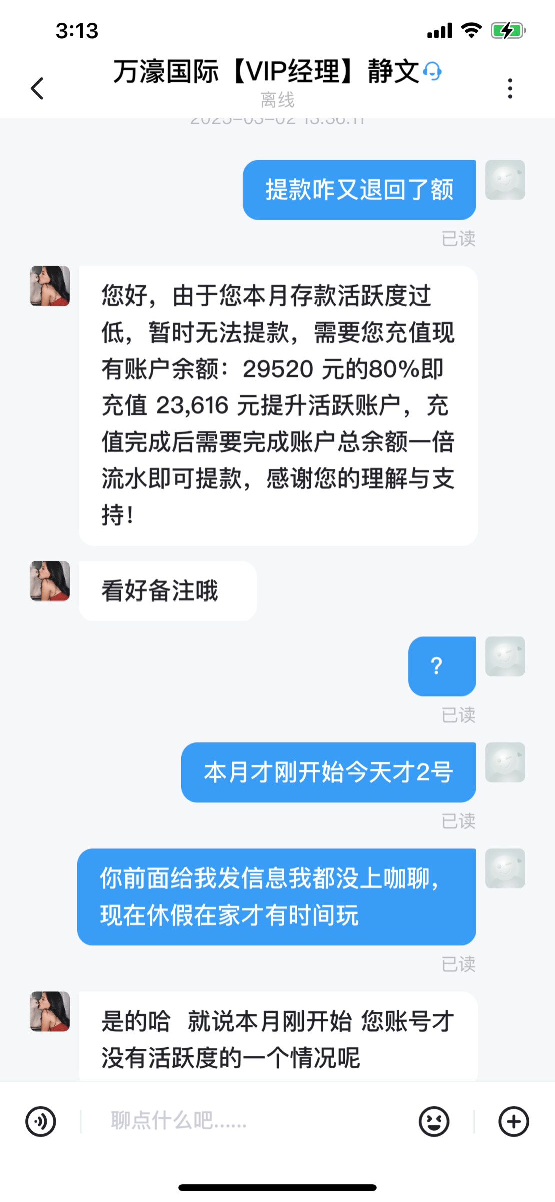 23年注册的号,时不时玩一下,冲了五六万左右,没什么输赢,去年11月份电话邀请回归,到现在几个月也是断断续续的玩一下,冲了差不多1.5w,昨天月初过去玩冲了800,糖果炸了2.7w,余额2.9w,提现第一次退回说注单核查让中午在提,中午提的时候又说我活跃度不足被要求充值帐户余额的80%两万多再打一倍流水。总之就是不给出款各种理由黑你。他们家开了很多年现在是活不起了, 3716.app万濠国际慢慢开始黑了。老哥们多注意点吧。 狗庄无耻!