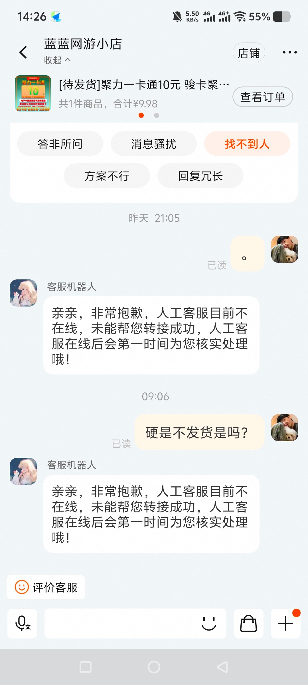 那个蓝蓝真死司马东西,没注意在他店里买了三单不发货不回复