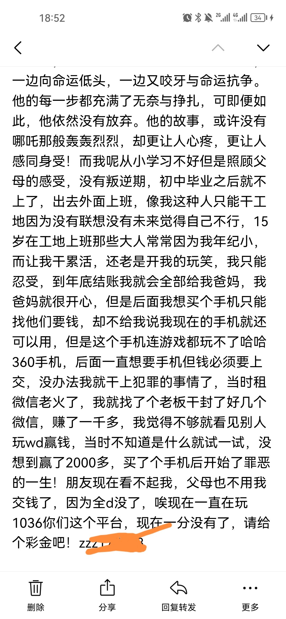 这个回复很快的,回复了说活跃的账号有机会获得系统彩金,然后几天了都没给,可能就是不活跃,玩彩也没给