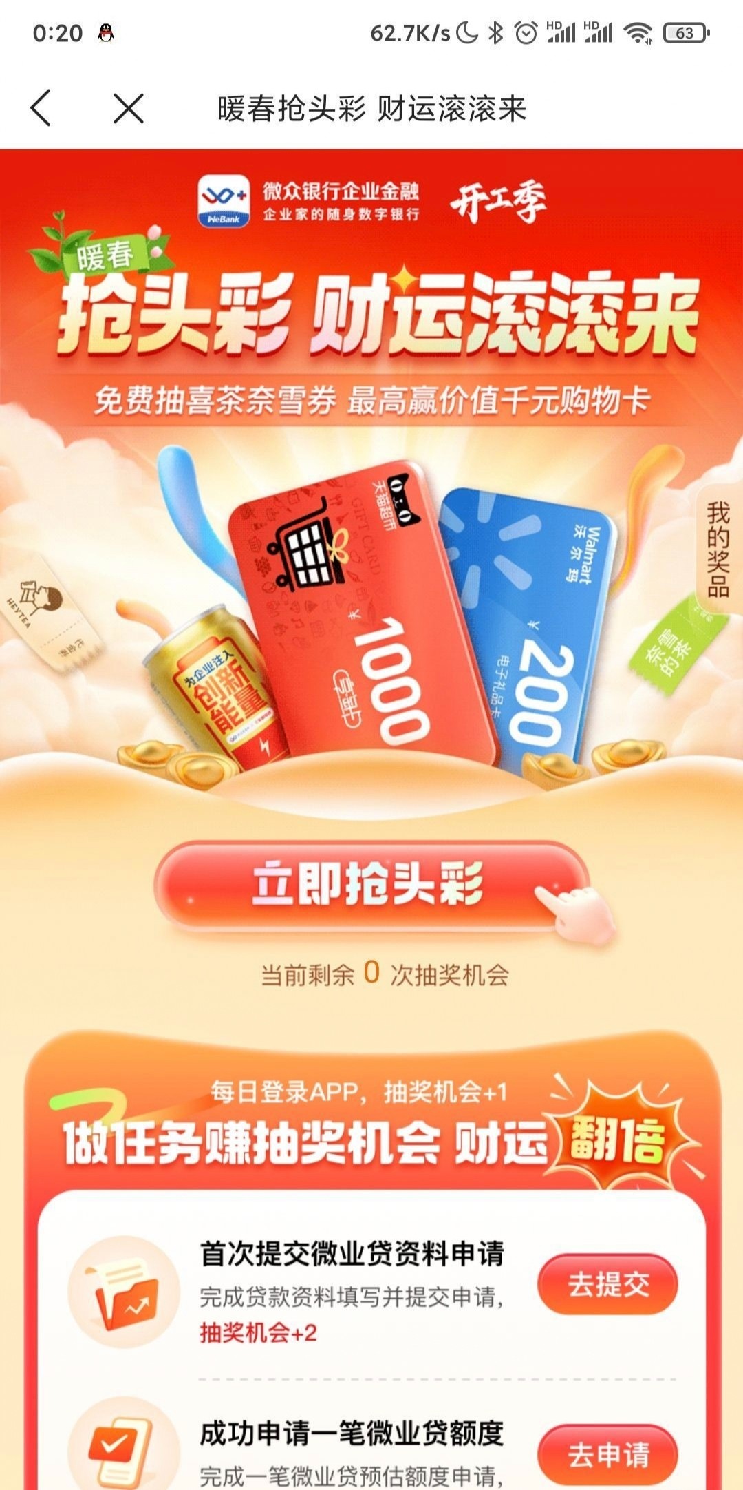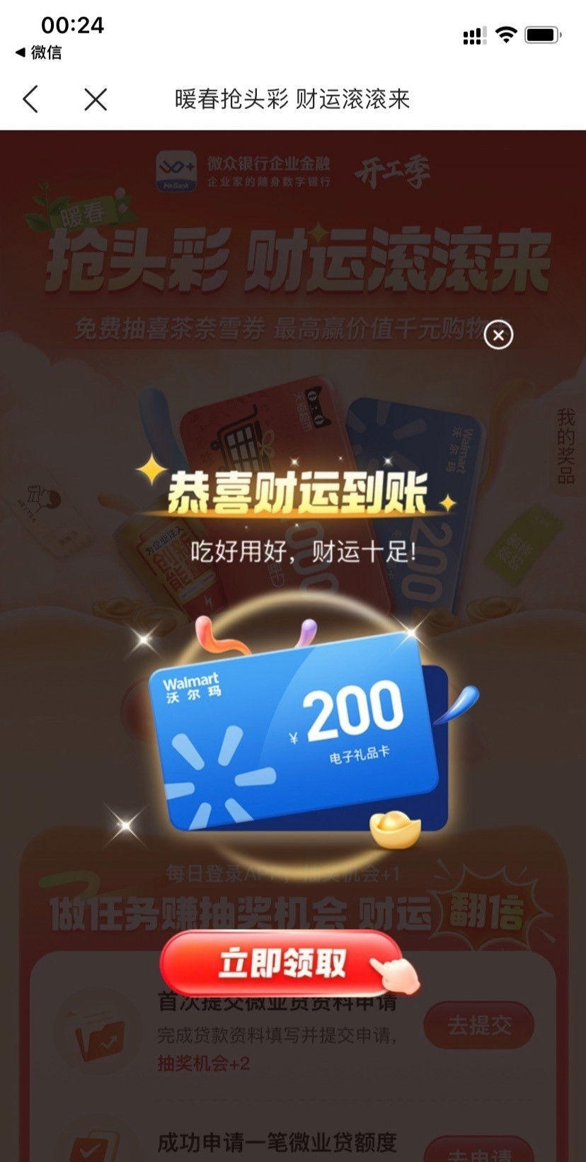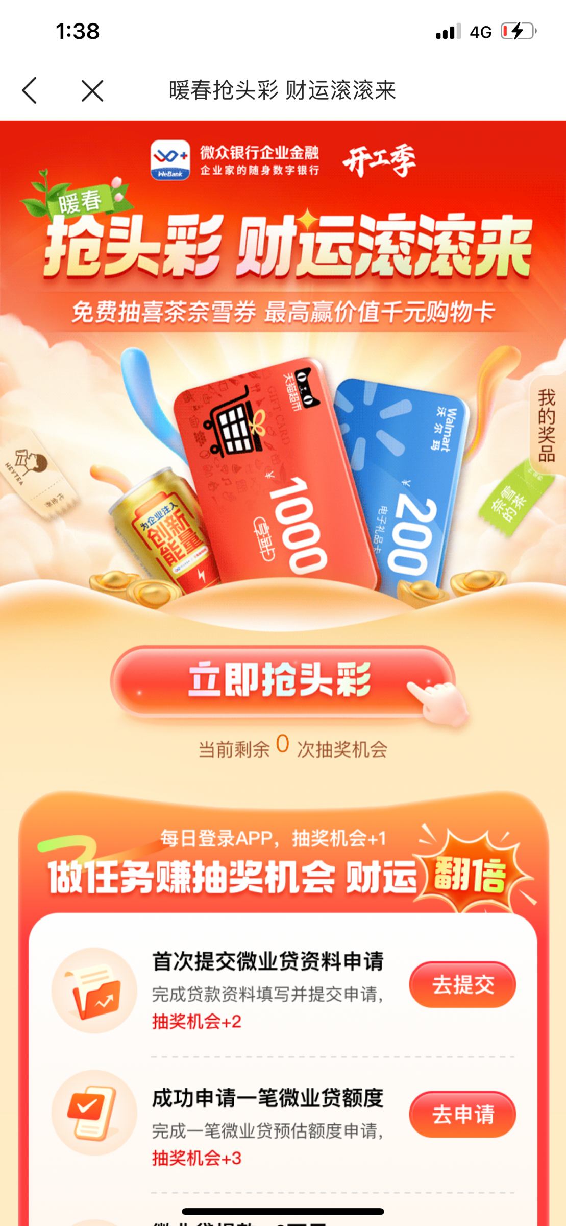应用商店或应用宝下载:《微众银行企业金融》,实名认证一下,首页有活动直接抽,刚中200沃尔玛