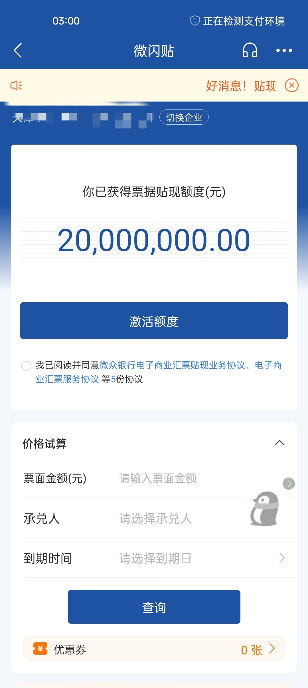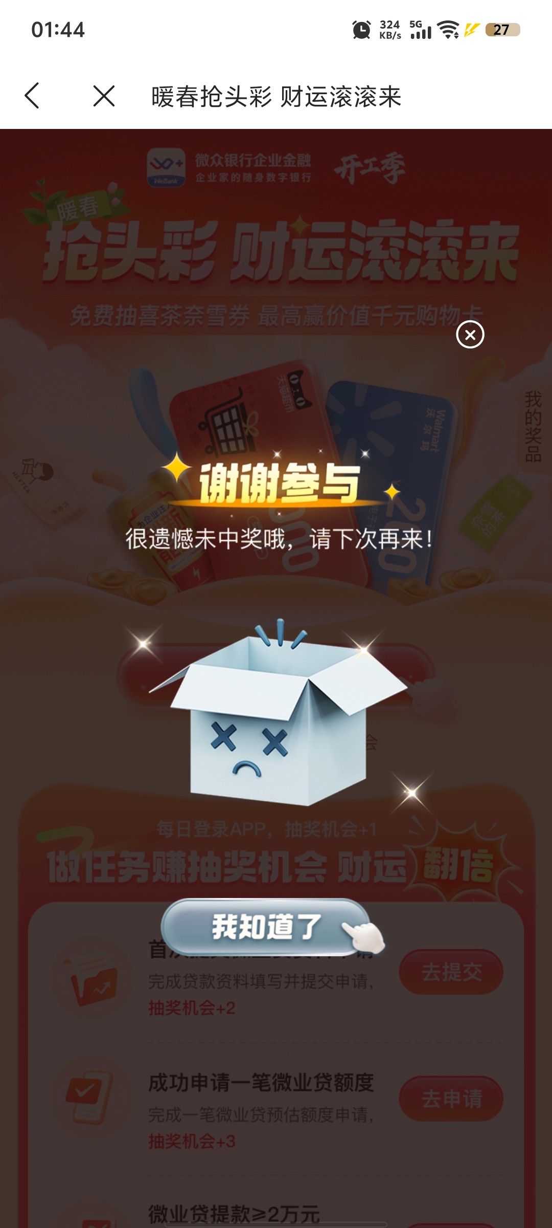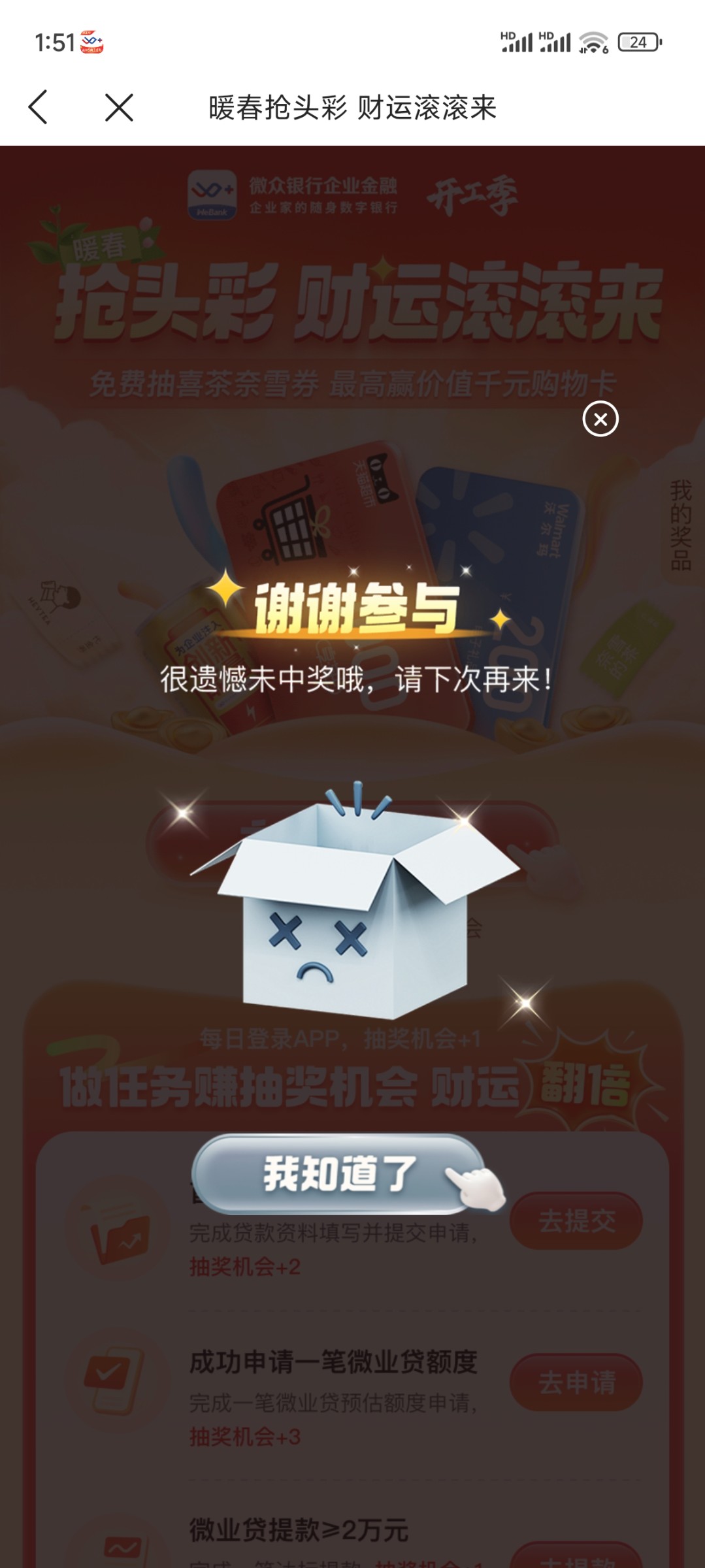 应用商店或应用宝下载:《微众银行企业金融》,实名认证一下,首页有活动直接抽,刚中200沃尔玛
