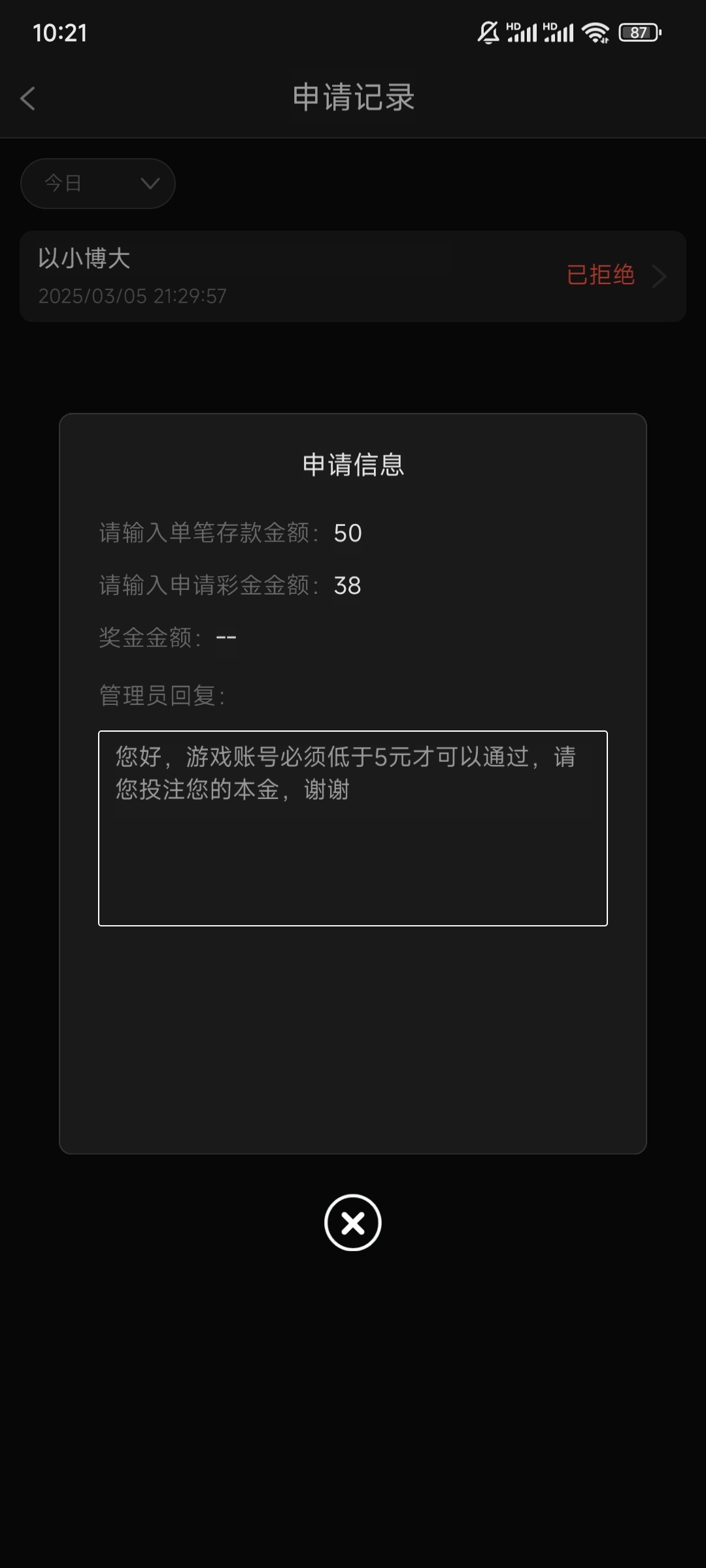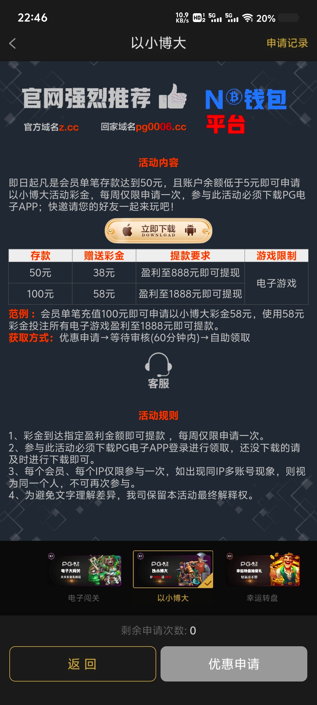 你这个以小博大台子太弱智了 不知道是不是他改规则 我申请他跟我说要余额低于5元才可以申请 问了客服让我先去玩电子 输到5元以下才可以申请 这太傻逼了