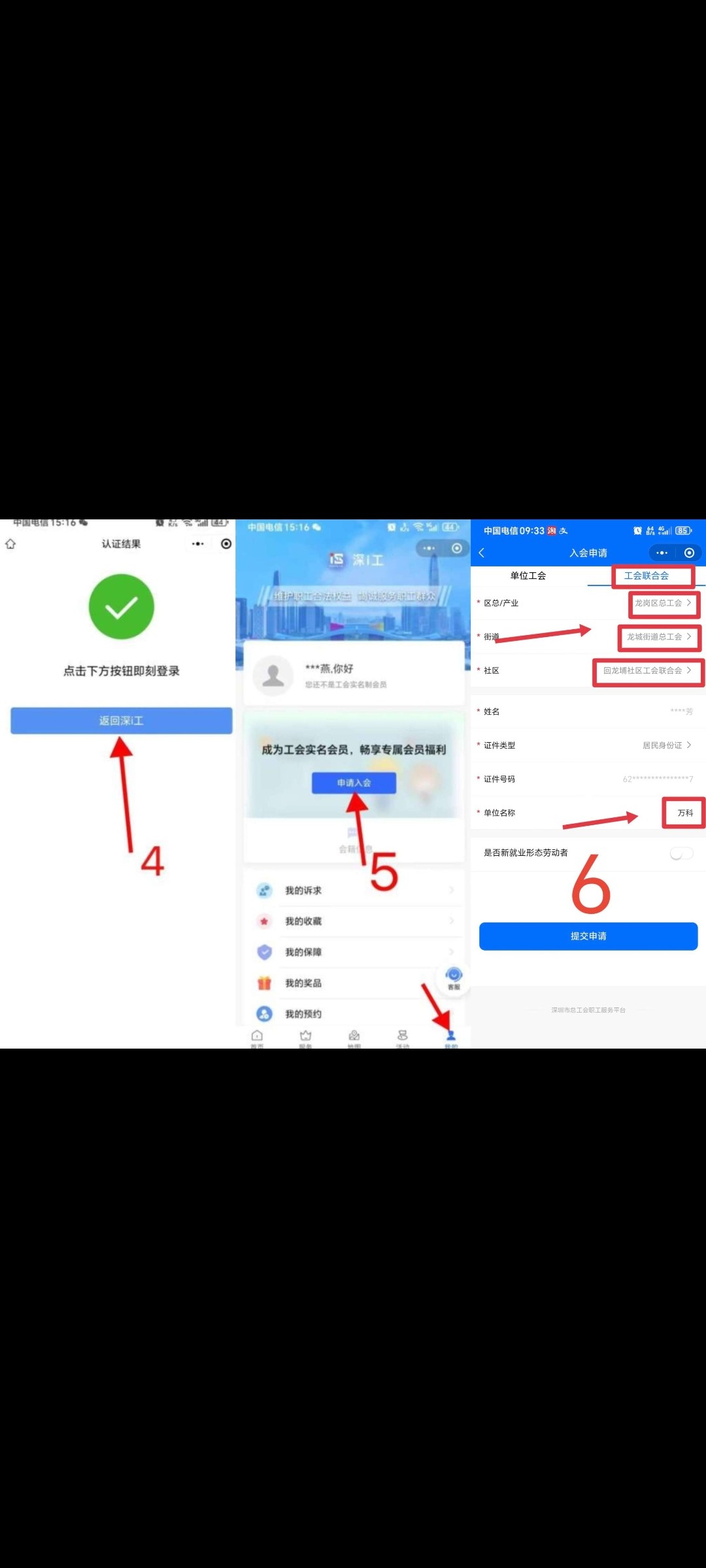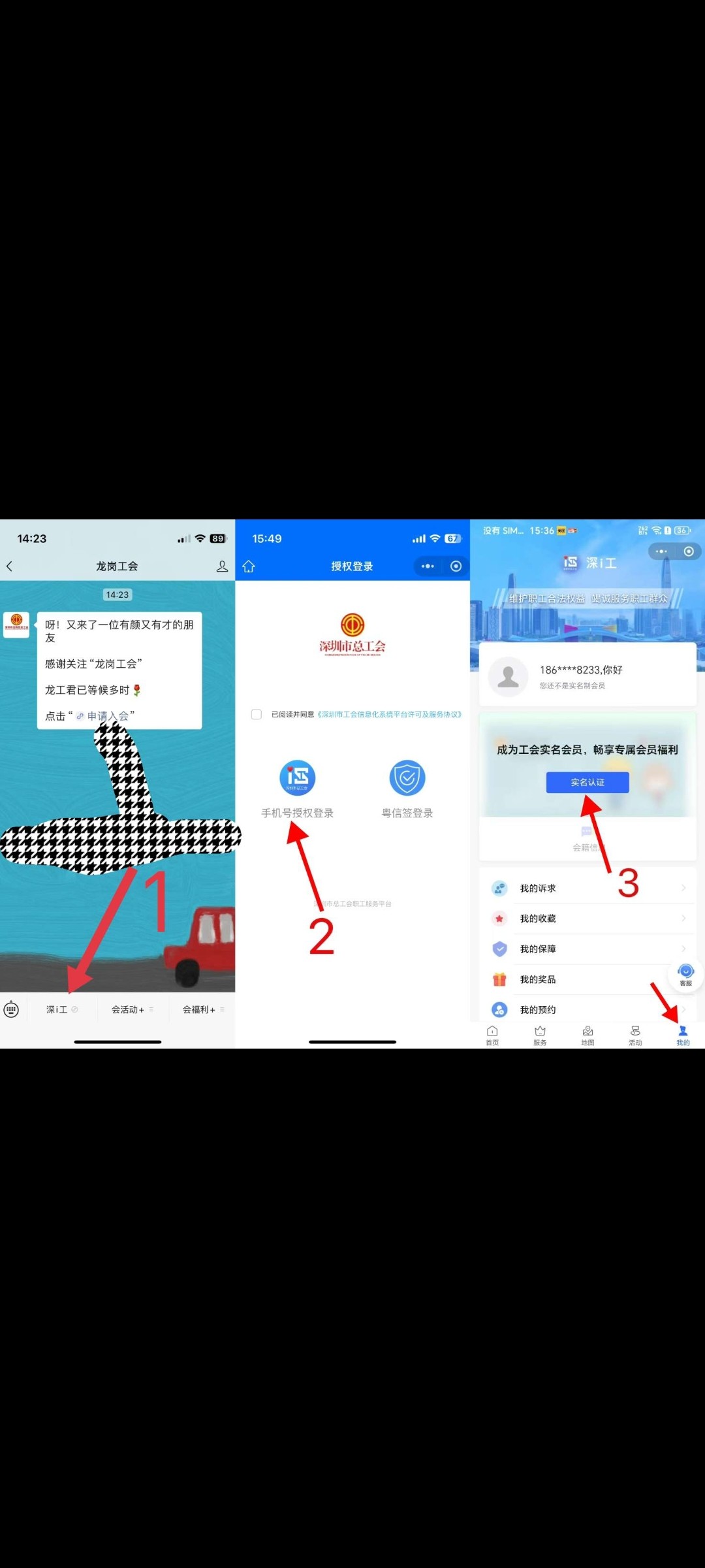 微信搜索(龙岗工会)公众号关注,点击左下角深i工进入小程序~点我的手机号登录~ 我的然后认证《看图1》