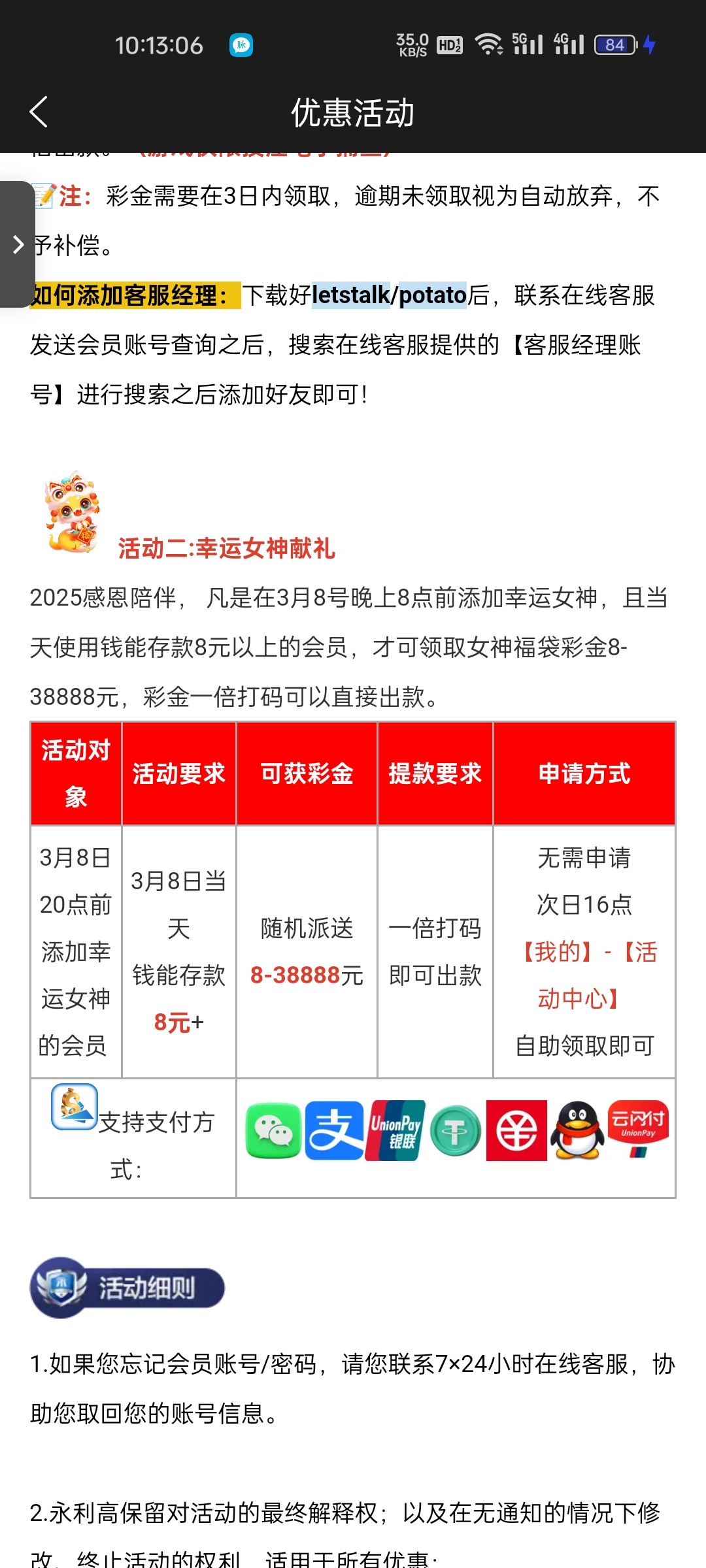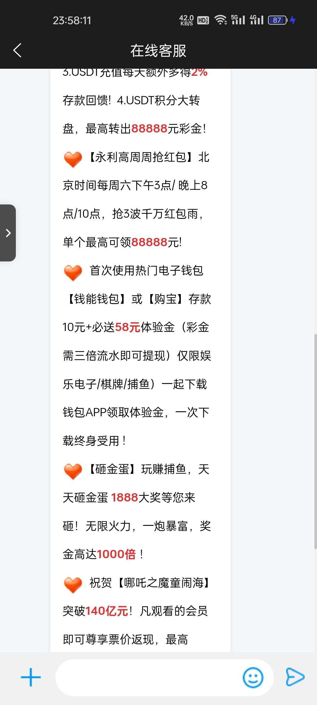 钱能钱包充值11送58三倍流水加上3月8号有充值活动充值11或者38自己看着博一下,可以两个活动应该不冲突11+58是稳送的。平台还有注册下载app彩金需要手持身份证照片28+58十倍流水要搞这个必须先下载app官方网站70.net 307.net容易多ip多实名名字容易重复的不要申请这两个彩金了。3月8号当天搞充值11元可以搞58+3+8+8一共77彩金或者3月8号充值38元可以领58+38+8+8一共112彩金。