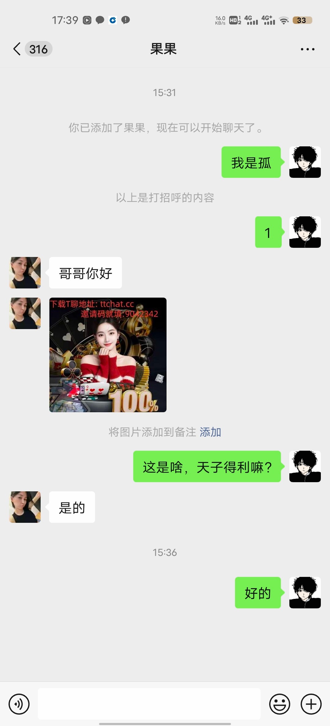 这是下午接到电话添加的微信,图上有t聊的邀请码,没撸过的老哥们,可以去搞。我前段时间就玩过了,所以没去弄。我看前面哥们发帖的邀请码不同,所以这邀请码目测是最新的了。