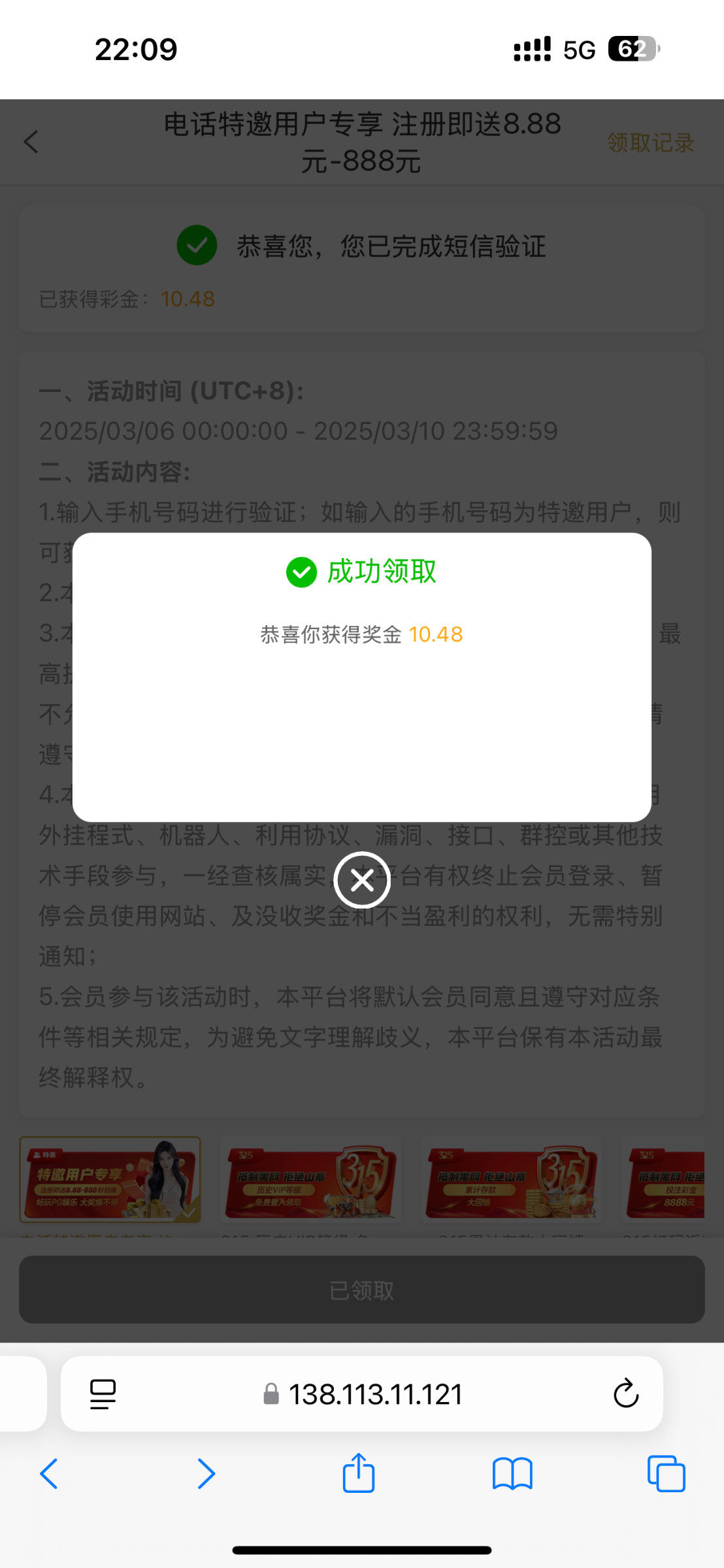 直接注册别用手机号注册 如果输入的号码被注册了 就登陆上去找别的手机号修改一下手机号 在登陆回来领 短信自助 地址100pg.com
