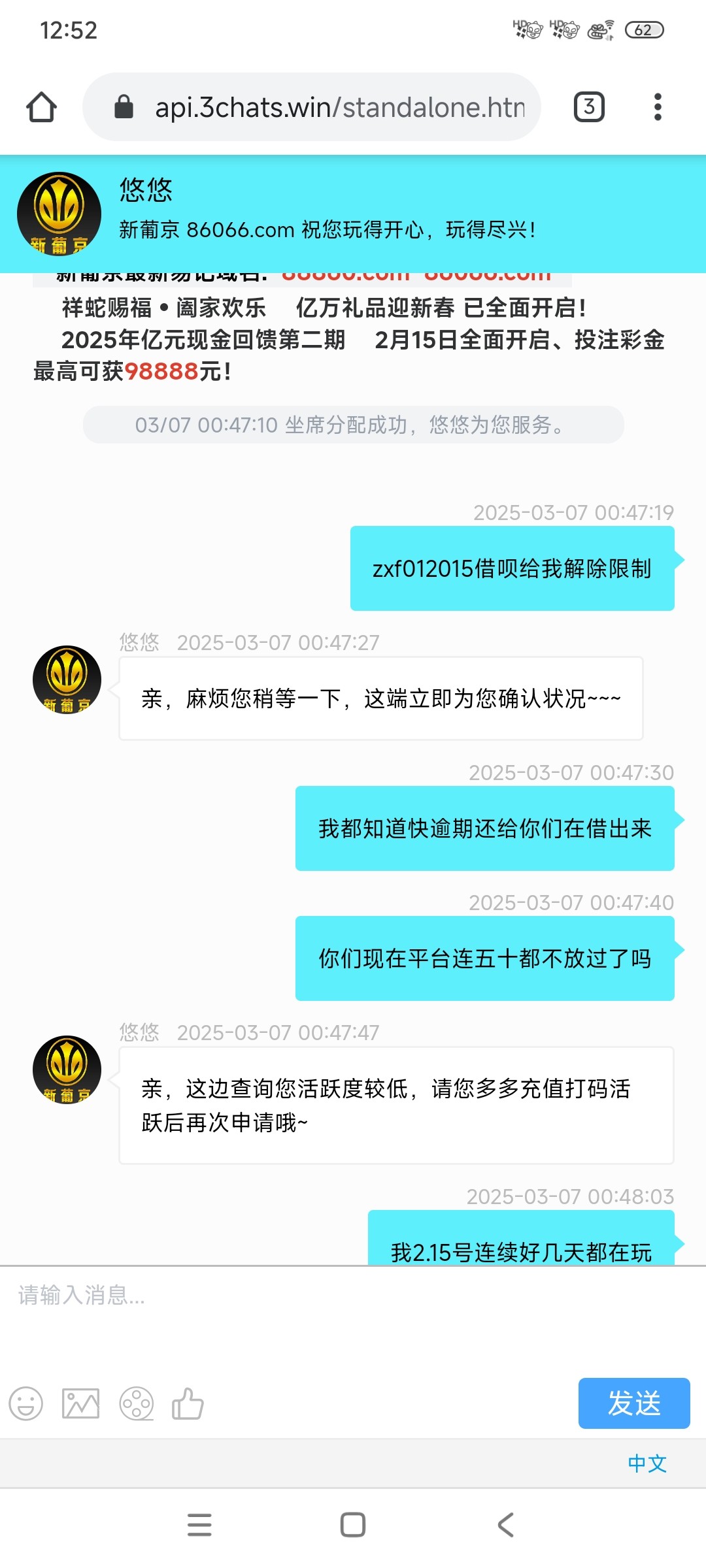 现在860玩不起来上个月提现五千钱能四倍打码不给彩金说我低倍打码。然后这个月借呗想着还五十在借出来就说活跃度低五十都不放过换平台玩吧