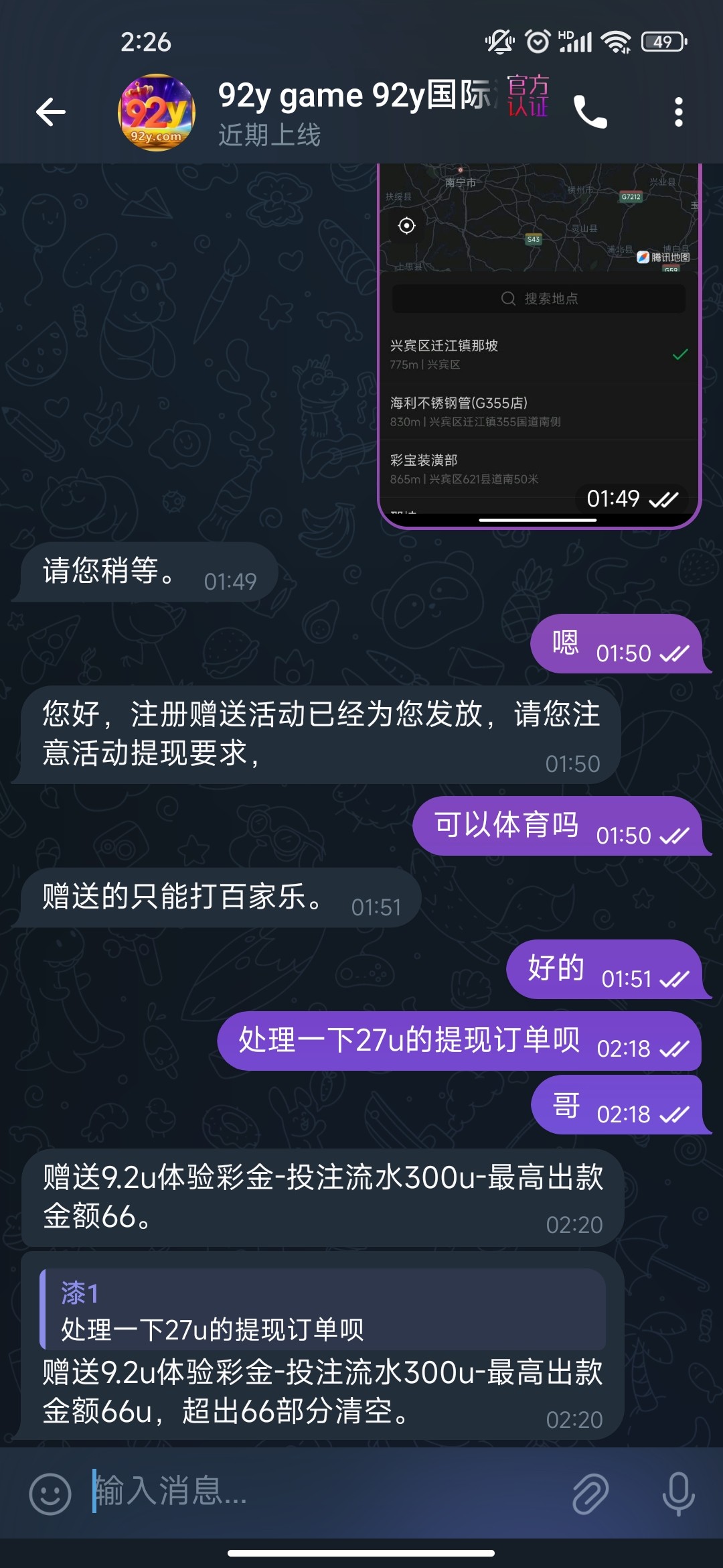 注册送9.21u要打300流水最高提现66u 找飞机客服申请 要ip地址和现在的位置给他 出款自测我没打出来