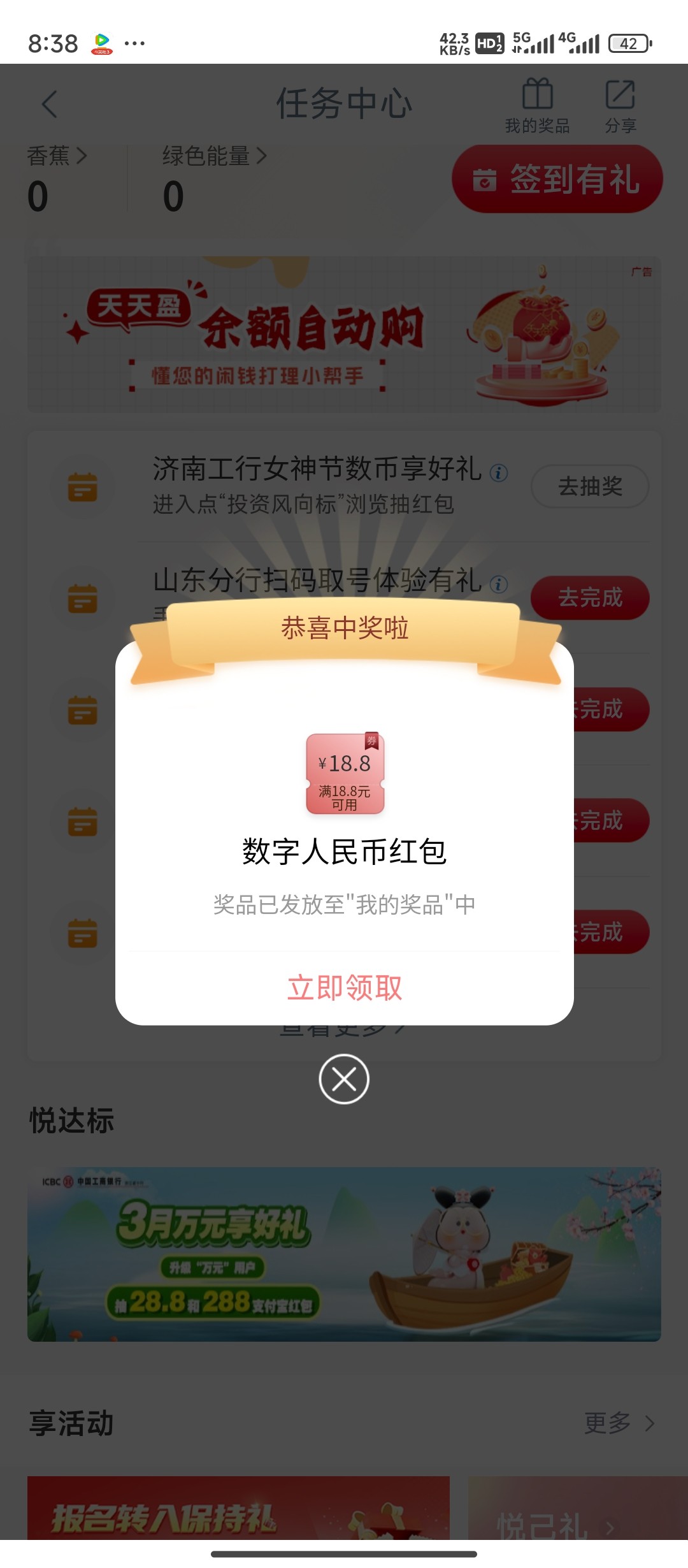 ①应用商店下载幻影分身,首页有抖音关注公众号就能获得几天的会员②应用商店下载一个工银e生活③把工商银行注销了④打开幻影分身,添加工银e生活,上面能设置位置,把位置设置为济南大学。然后打开e生活注册登录,然后绑卡(四大行不行,随便绑一张野鸡二类卡)一定要显示绑定成功,没成功就换一张卡⑤打开工商银行注册登录,搜索任务中心,有一个任务《济南工行女神节》,直接抽。必中18.88数字人民币红包。扫微信经营码可以无损套现⑥注意一点,工商银行手机号要跟数字人民币的手机号一致。不然你领取不了