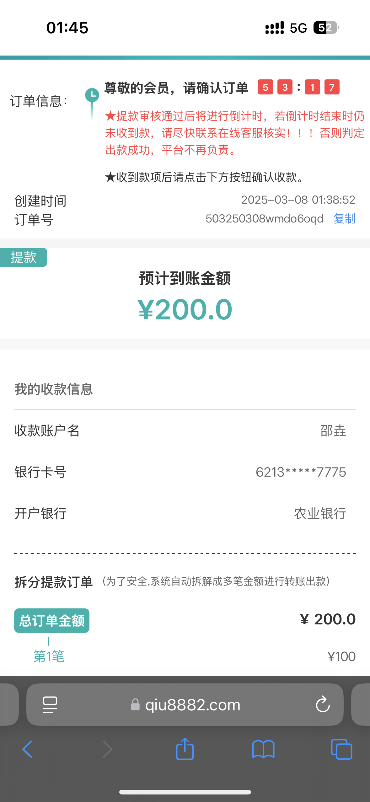 昨晚就打出来了200到现在还没提 已经封一个号了