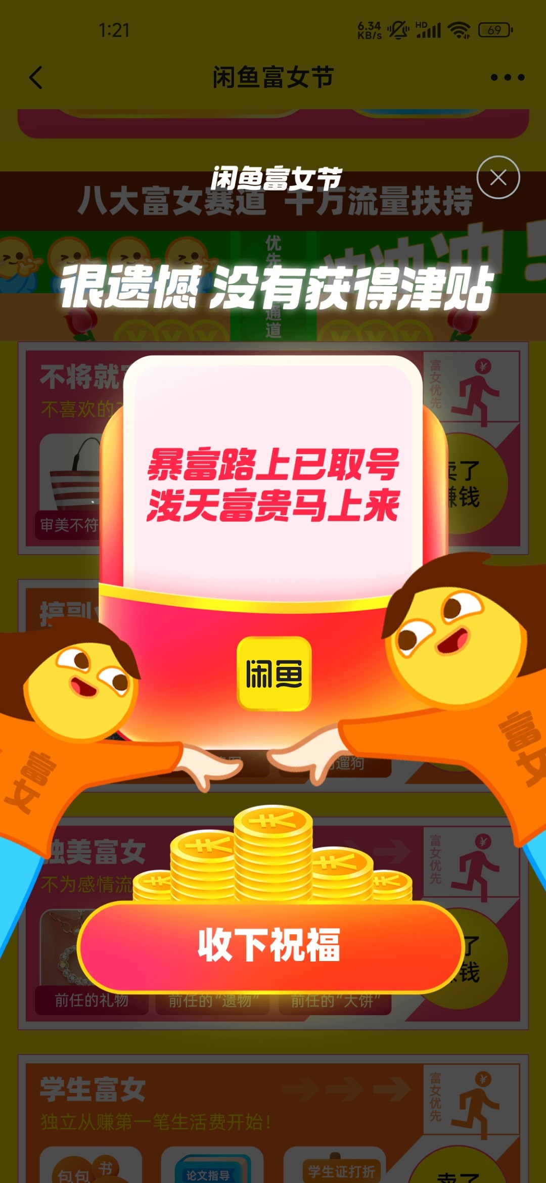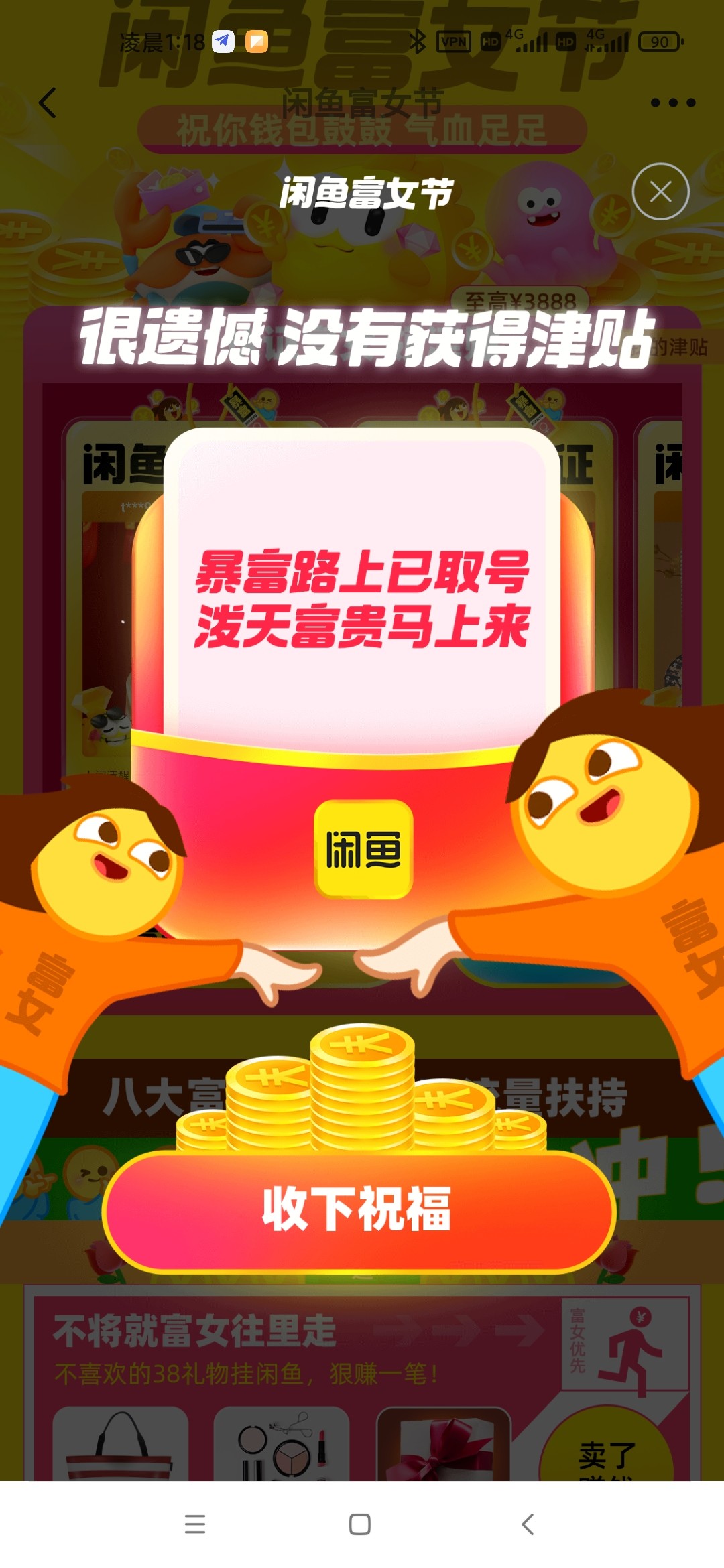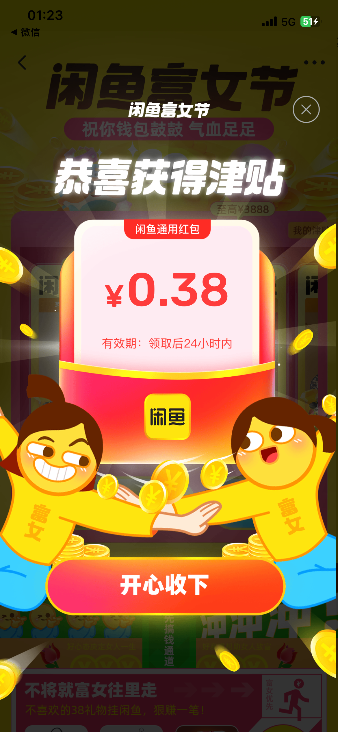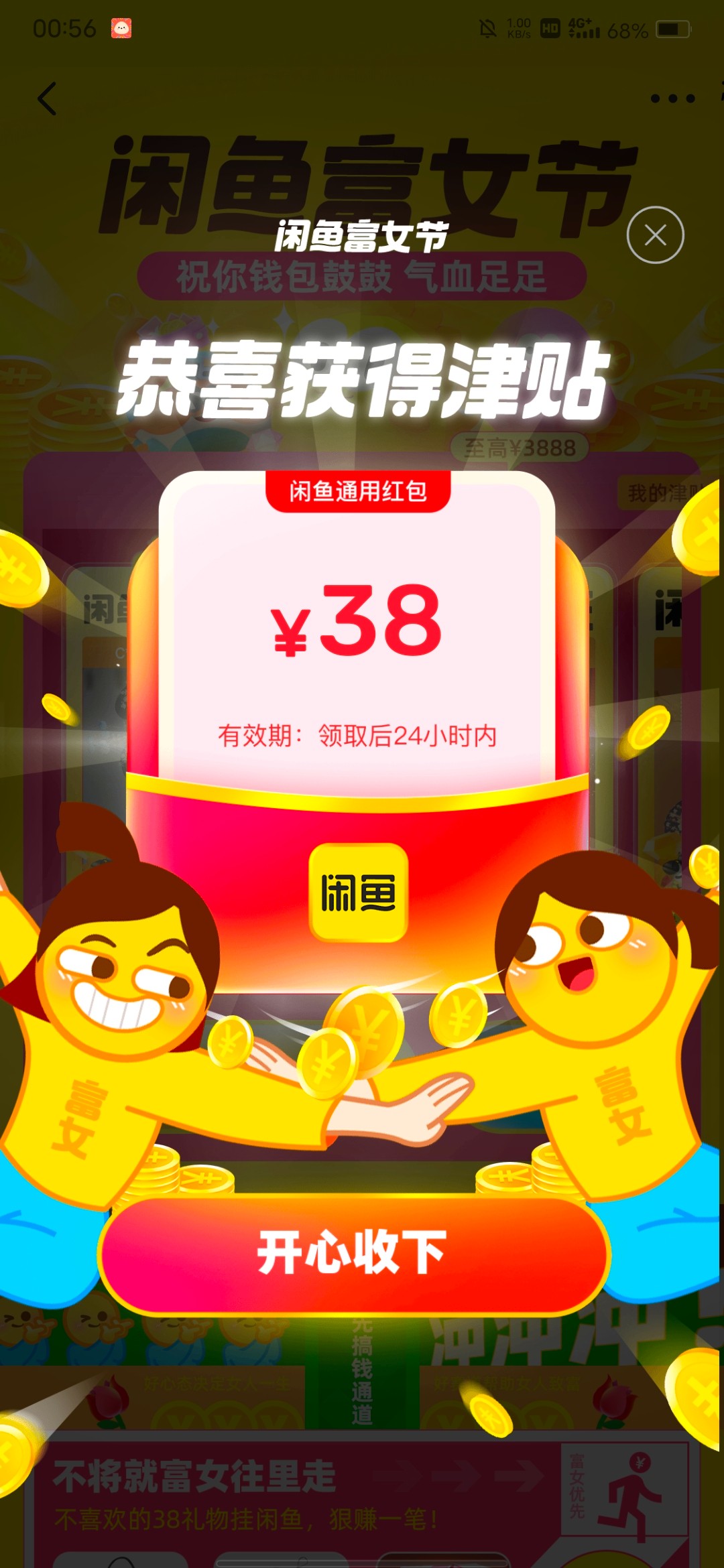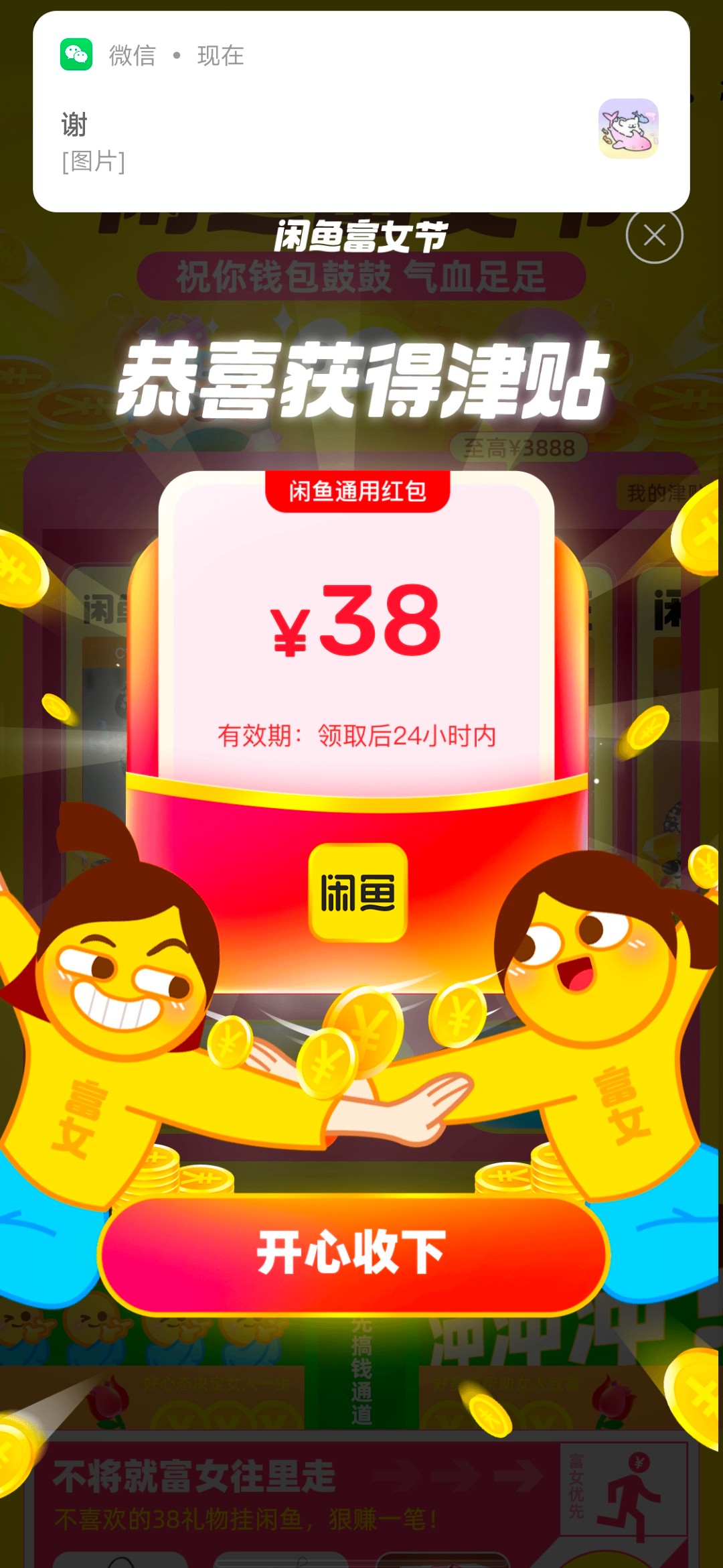 闲鱼性别改成女,首页搜妇女节 上传图片随便一个女性的照片,分享微信,随便分享个人,性别改成女去 有大包速度,亲测中三个38,买京东e卡或者冲话费变现