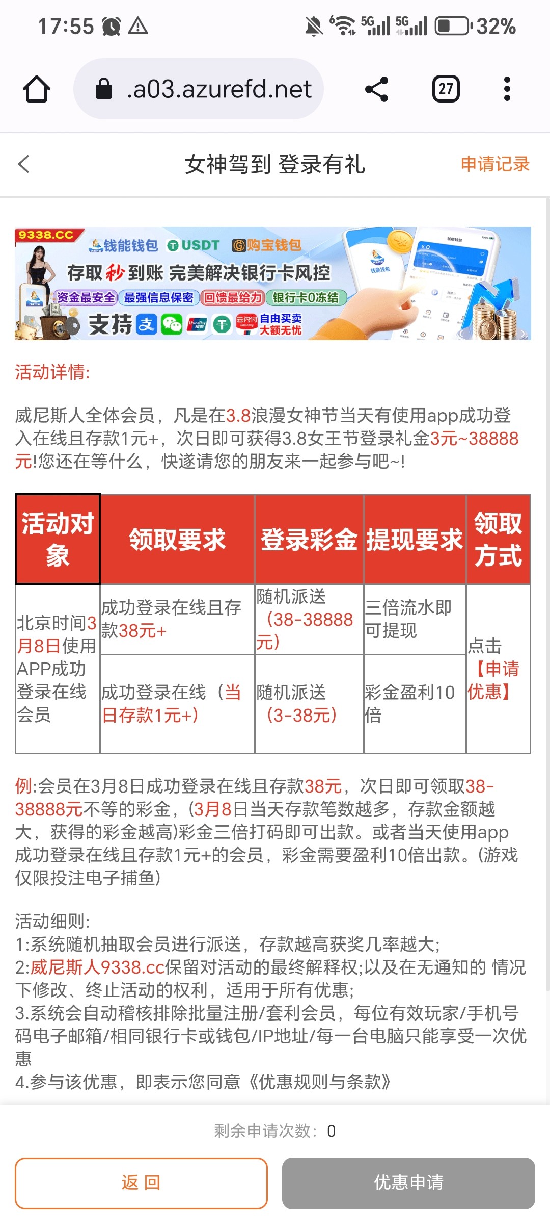 网址9338.cc 女神节活动(全体会员) 3.8号当天登录App存款38+ 第二天申请38彩金 玩这台子的老哥们可以留意一下 我小额打了两次都出款了 大额不详