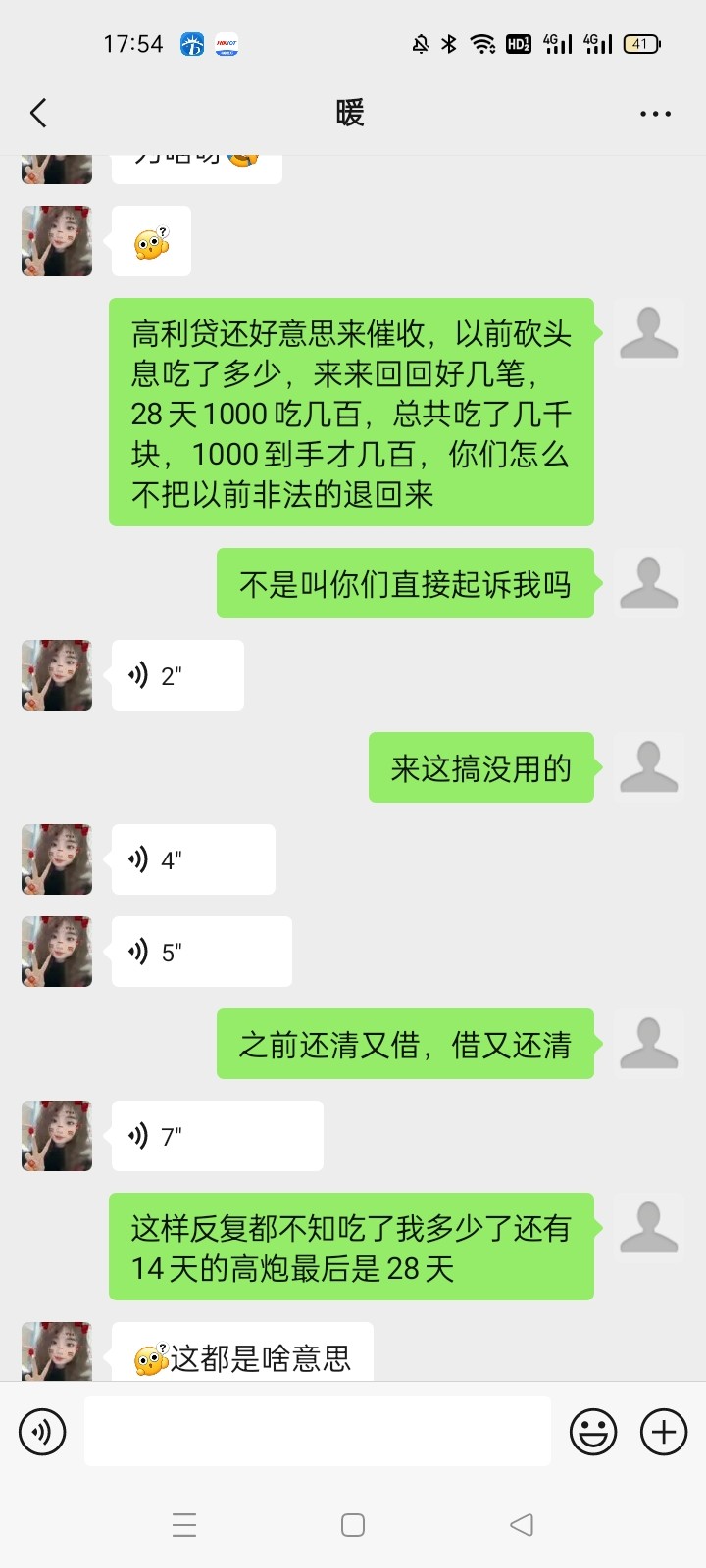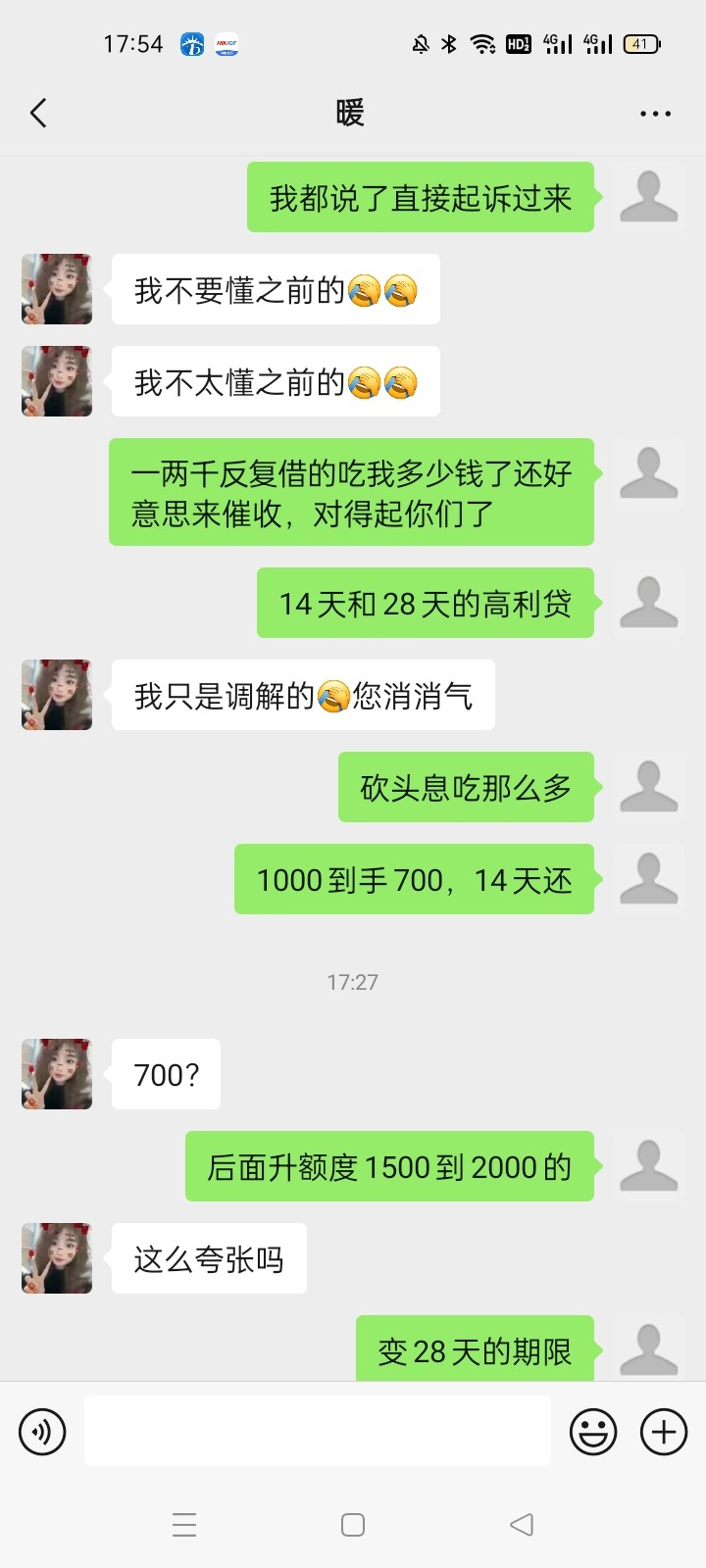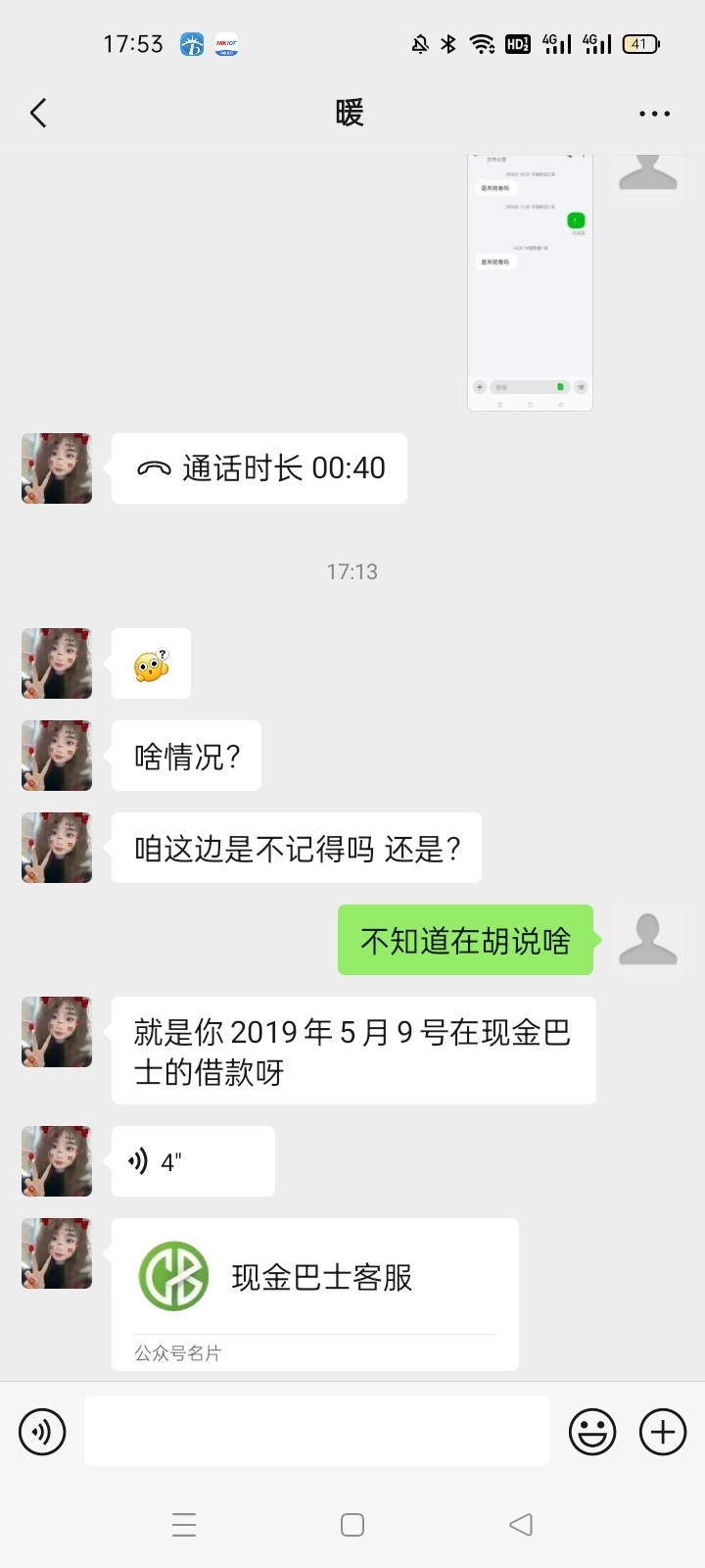 我都换手机号好多年了,今天收到短信+微信的,我以为是哪个台子的特邀,加微信然后就是聊天图片那样了,这个高利贷来的,砍头息吃我好多了,得得起他们了,还不知足,还过来找我催那1000多块钱,吃我砍头息的反复那么多次都有两三千块了,14天的高炮,后面是28天的,老哥们有没有借过现金巴士的高炮,有被起诉到法院还款的吗?我抖音搜了一下真有起诉到法院的,而且还款了,这APP也下载不了的,如果合法的那应该下载得了的吧,好像2019年现金巴士才倒闭的,那年现金老板被抓的不知是不是,之前打电话一听是催收的懒得说直接挂断,今天收到短信+v以为是哪个台子特邀,我操原来是催收,直接怼过去到只能发表情