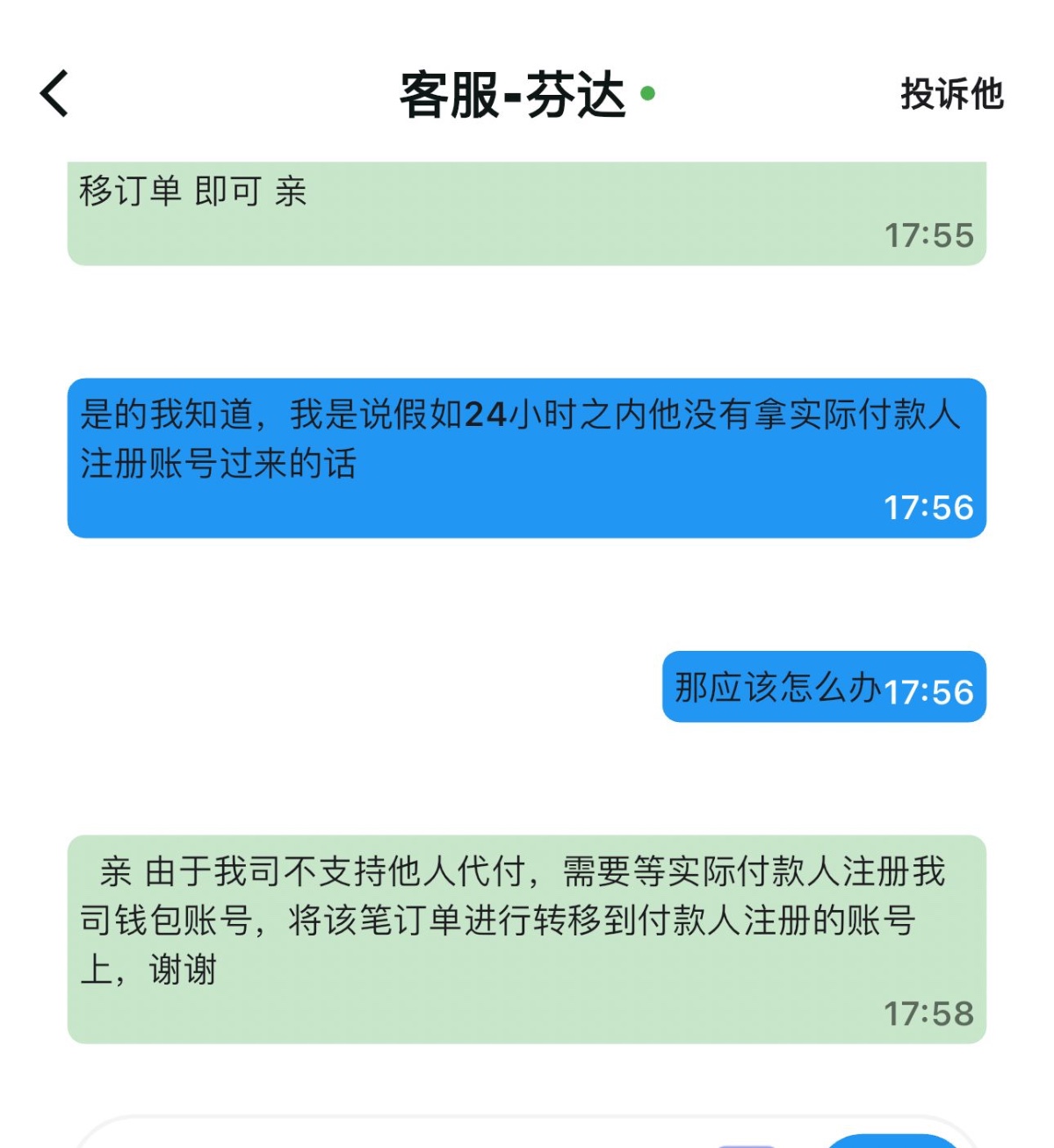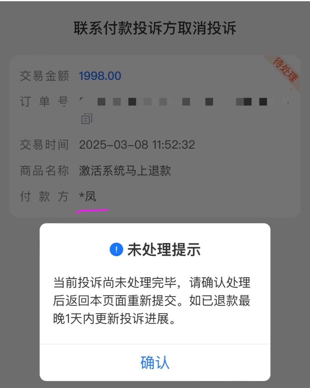 事情是这样的就是对方用的不是kd同实名的支付宝账号付的款。然后他账号成交率很低而且还备注“激活系统马上退款”,我看他实名也不同还备注了这个东西我就找客服去了,过了几个小时他就投诉我支付宝了我想着退款然后取消订单,但是客服那边不同意。问问老哥们的意见,还有我真不是恶习不放币骗钱因为k豆上面成交率低的真的好多p图的,我看到成交率低的我一般就取消了,但是连续取消3次会禁用一个小时,我想着看他搞什么幺蛾子要是p图的话我就折腾一下好过禁用一个小时