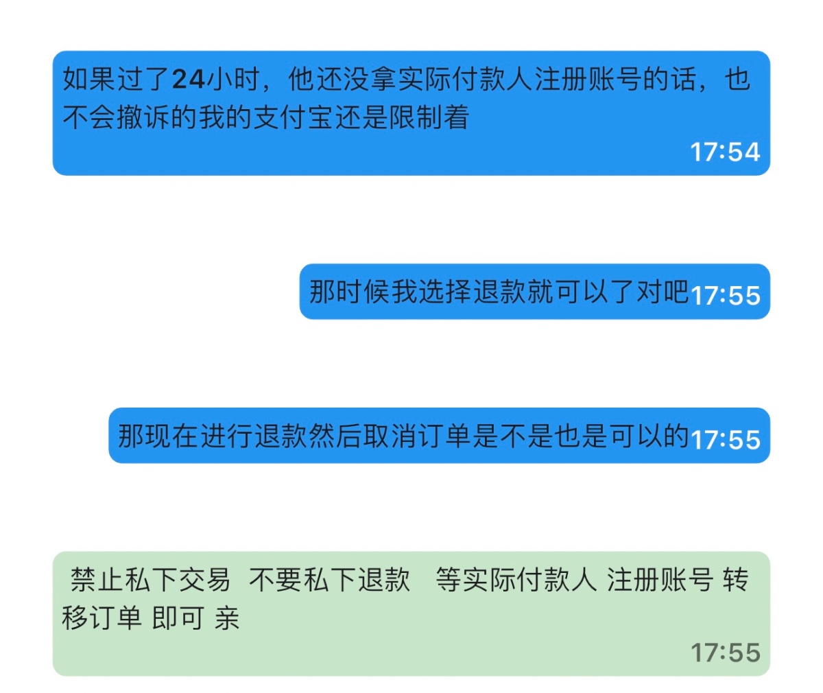 去飞机开户,一个买家信息有姓名和手机后四位,另外一个有支付宝记录,两个户口都开了看地区。这种大概率就是赌狗用家里或者对象的账号付款,然后输了想从你这里报销。你真觉得一个让诈骗的人,会聪明到通过付款记录找你私信,让你退款吗?或者你故意去凉着他,不回信息,如果是赌狗用别人支付宝给你转的钱,他现在肯定是张口闭口让你退款。