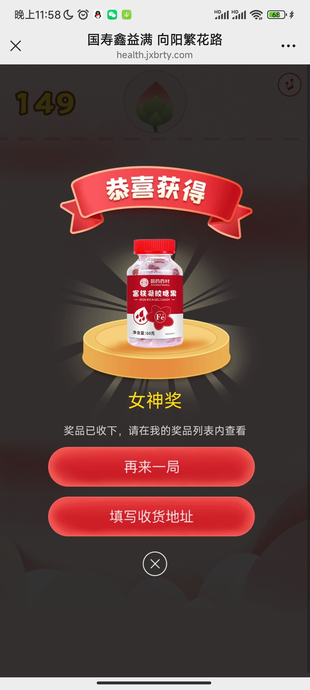 微信打开连接三次抽奖机会,包中糖果,自己填地址就行了,刚中,名字和性别填女的吧,不知道查不查我填的是女的 https://health.jxbrty.com/mp/apps/henan/25-02.html?u=1MTkwMjMyNTM&a=2NzEyMA&type=b163f9e8&obey=055So5oi3#/customer/game