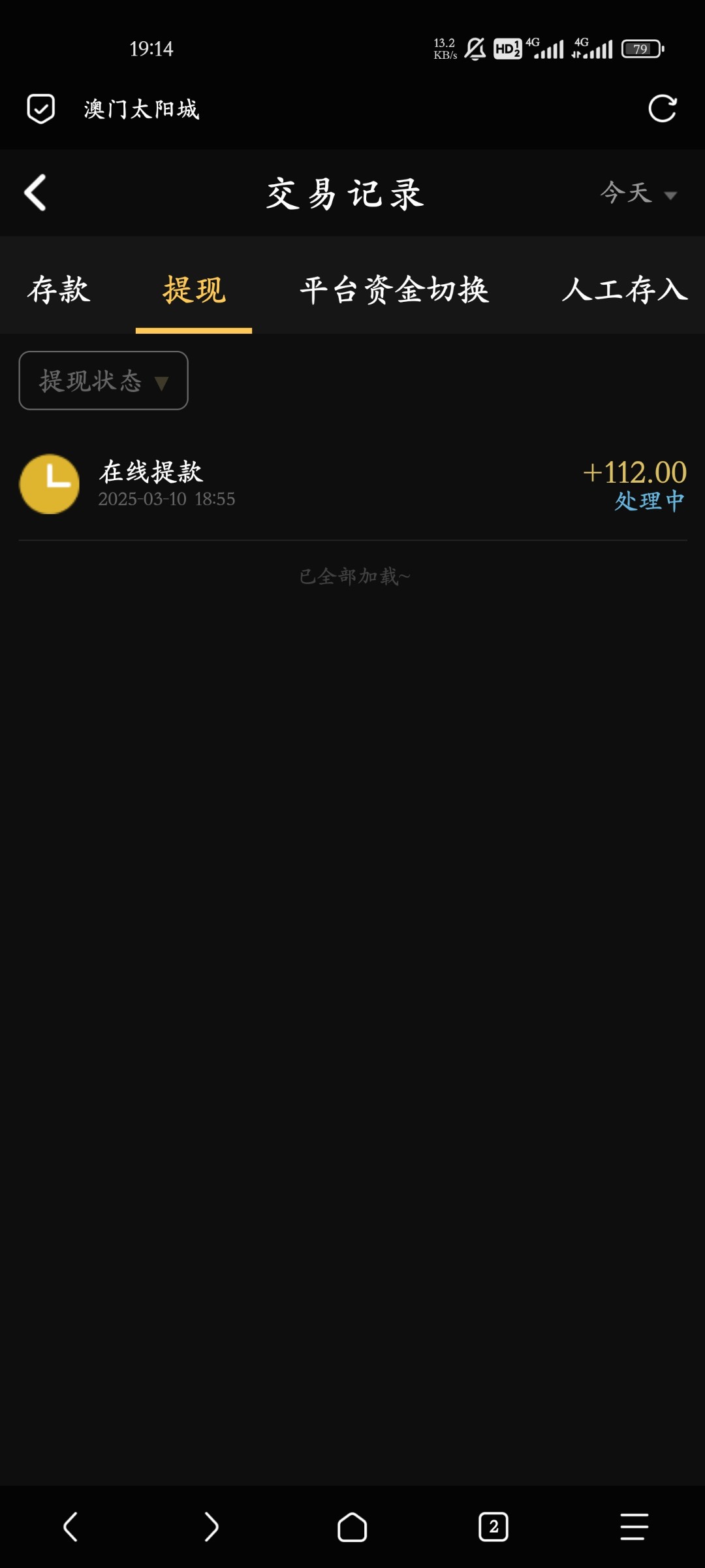 打电话说派送88特邀彩金,结果送了18,打到100多,提款玩充值同等金额。黑台来的,大家注意了 ,他还有首存送百分百,别上,死妈黑台。充值了也是出不了