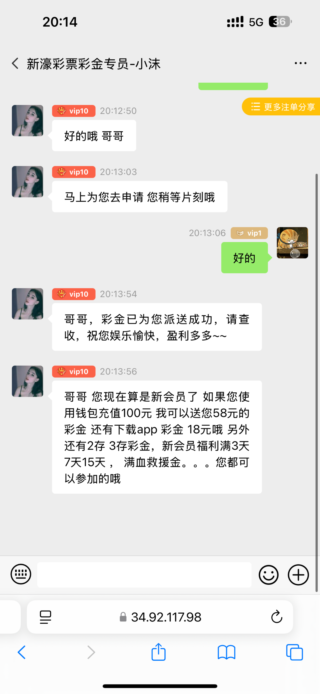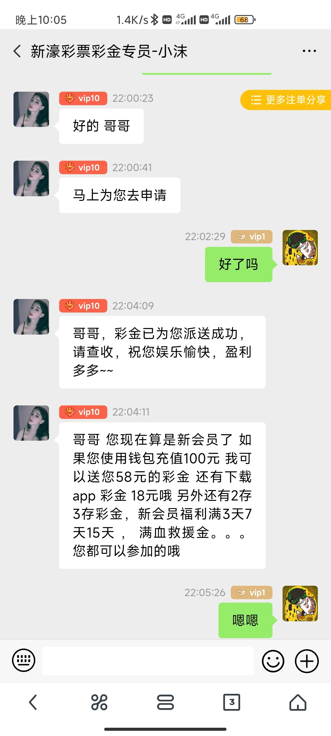 接到电话。去聊天室找彩金客服说电话彩金什么也没问直接送了应该能碰