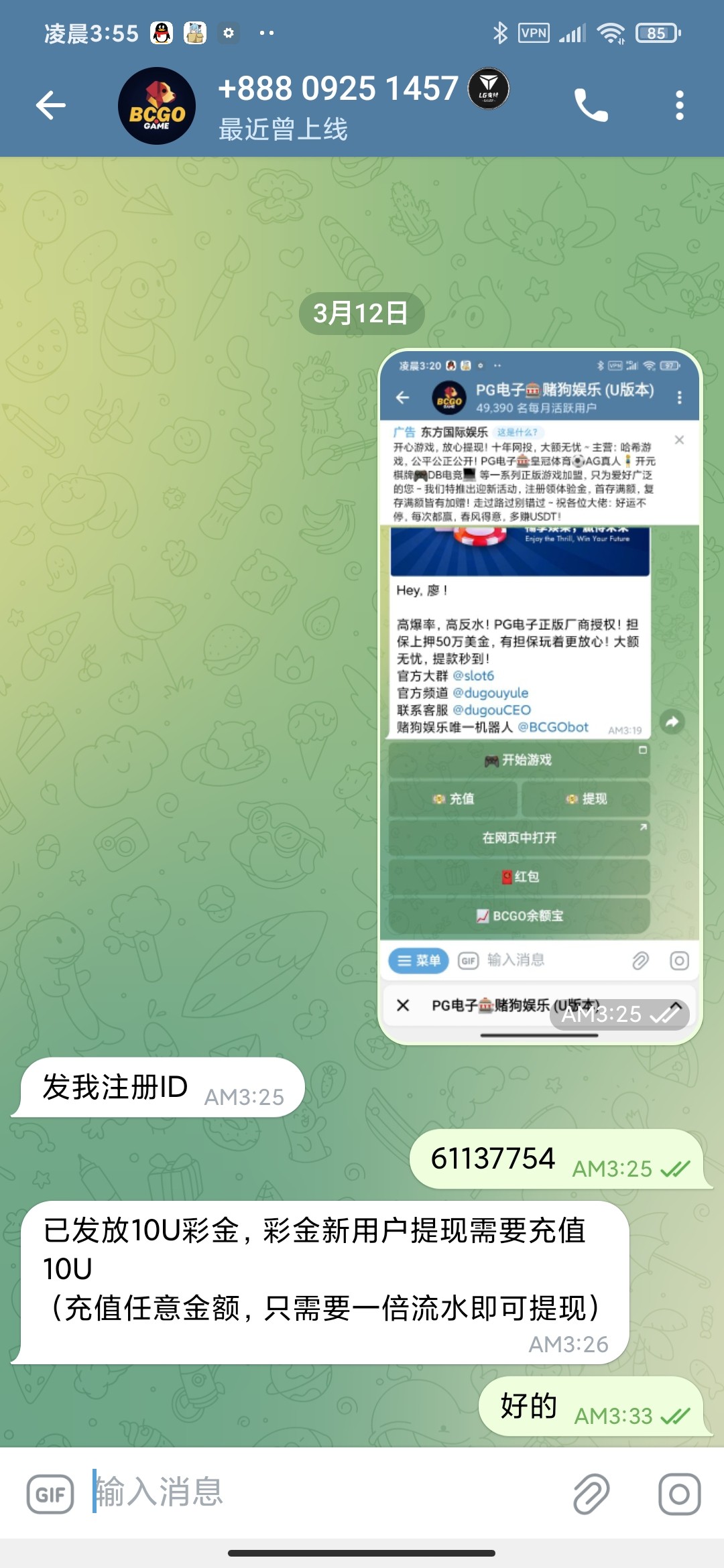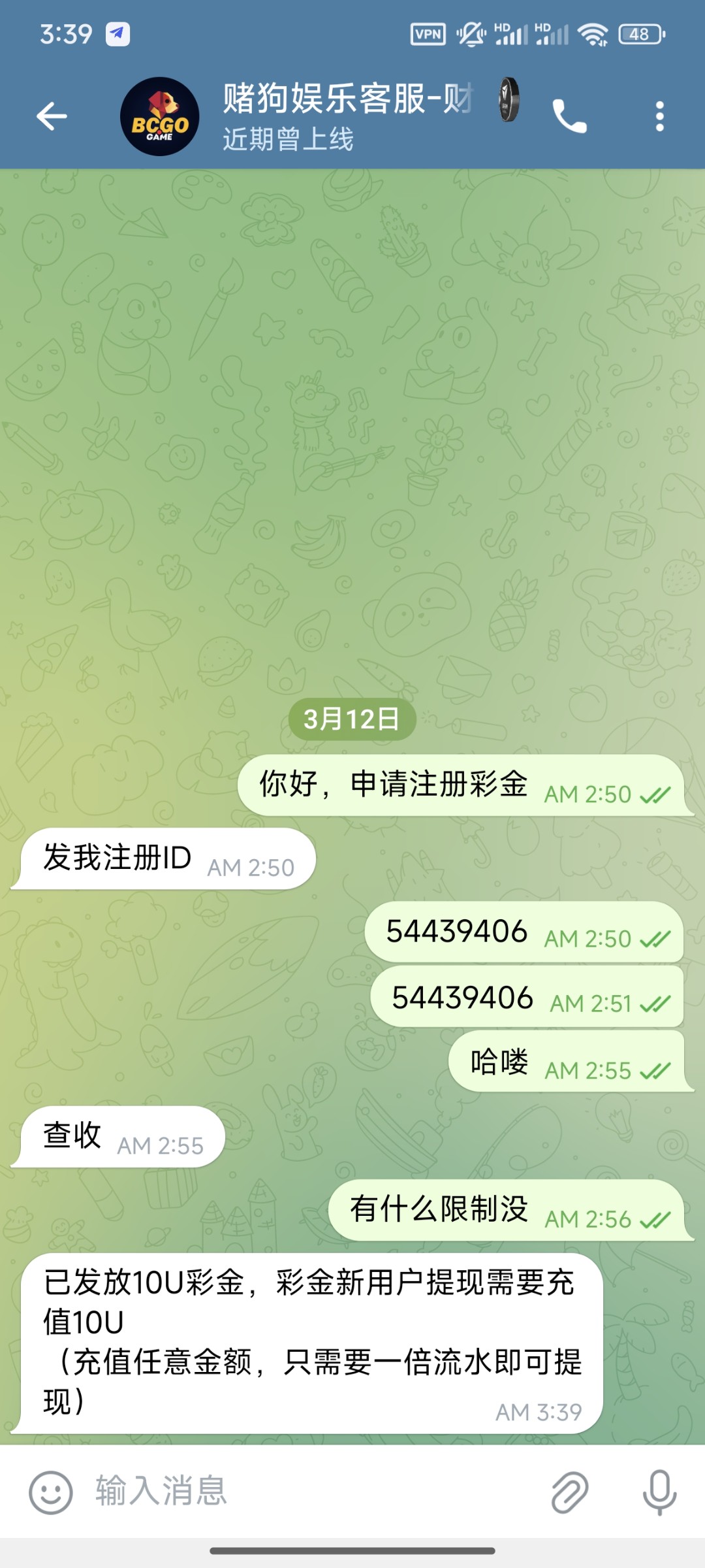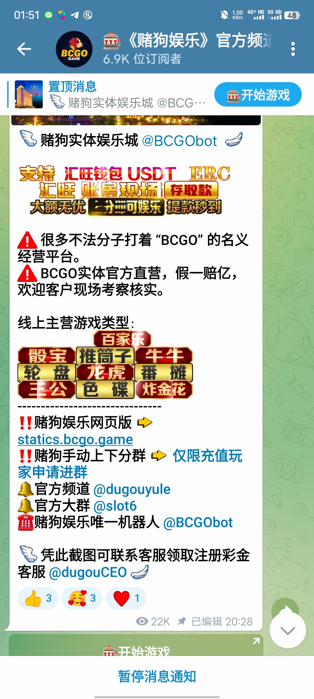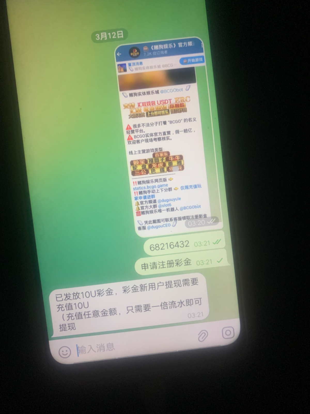 飞机搜频道@dugouyule 进去频道里面注册 然后截屏频道页面联系里面飞机客服发截图跟游戏ID领取10U彩金,彩金没有啥限制,随便打打 提现页面能提就可以提了。我没打出来,打出来兄弟记得来帖子反馈一下。禁止充值,充值风险自理。