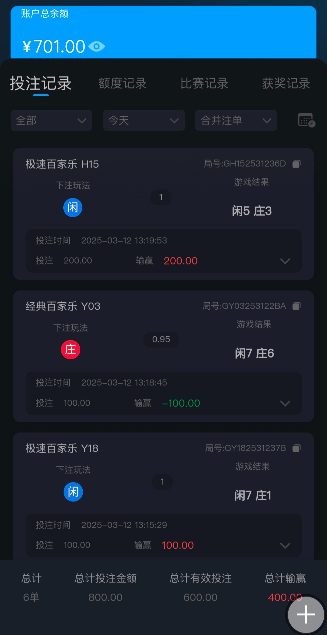 老哥们真人别玩ag了,有时候真的看不懂以前每次挂壁的时候都是ag梭哈没了,上头的时候狗庄就跟定位杀一样,冲几次下啥杀啥,顺龙断,断龙顺,今天也是电子输两百又想着去ag玩下,结果上去又是七连杀,然后去dg玩了下赢了几把都不敢梭哈,身上没多少钱,怕输了挂壁,下了五把输一把,这在要是刚才继续ag梭哈我估计就要身无分无了,太离谱了ag真人