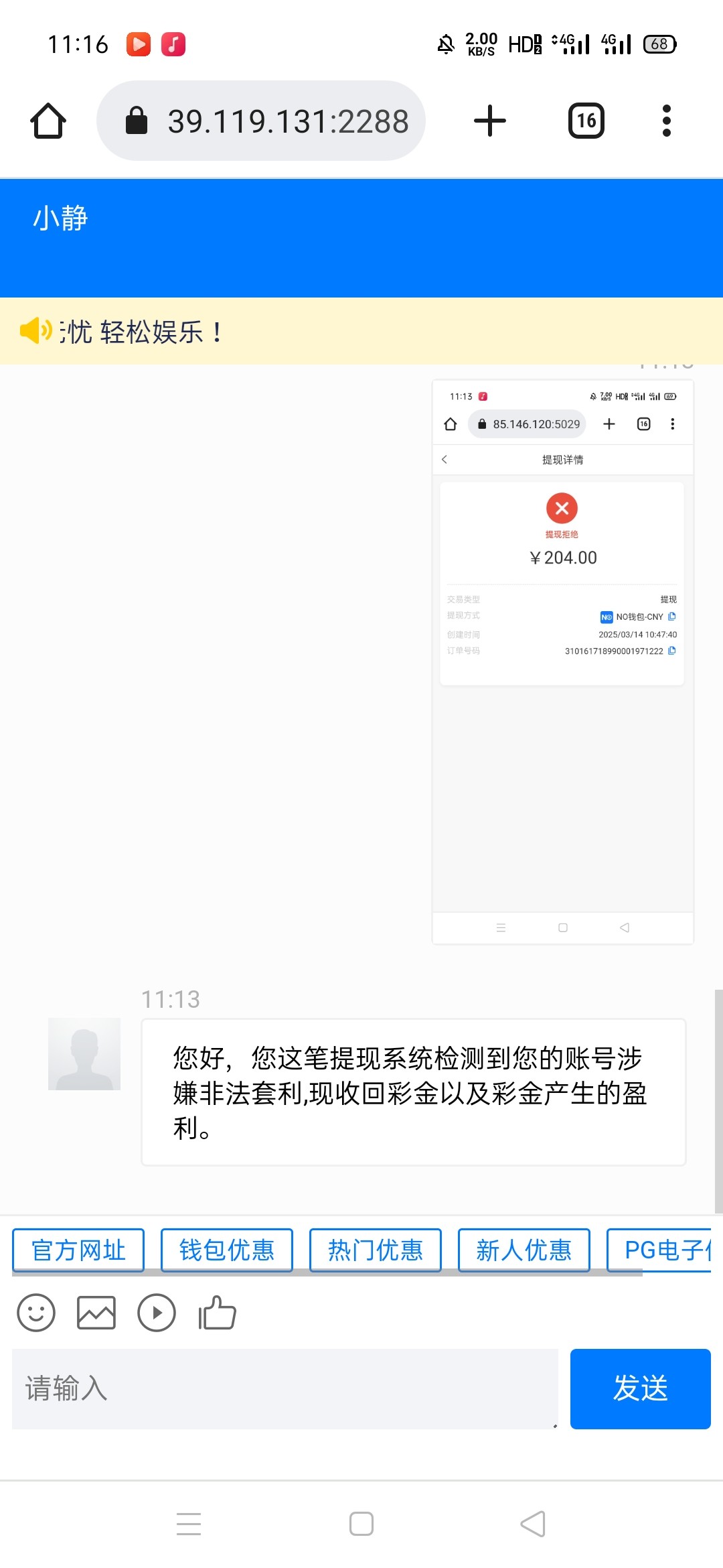 刚来短信的时候我就点开注册去优惠大厅里短信自助领了21彩金打上五百多只能提204,然后就藏了个4块钱的胡 等堤到帐了再充20进去爆了个一百多倍打20流水就提了四百多没想到到帐了第一次发帖领取没啥经验!短信链接http://83778.shop 官网204.com