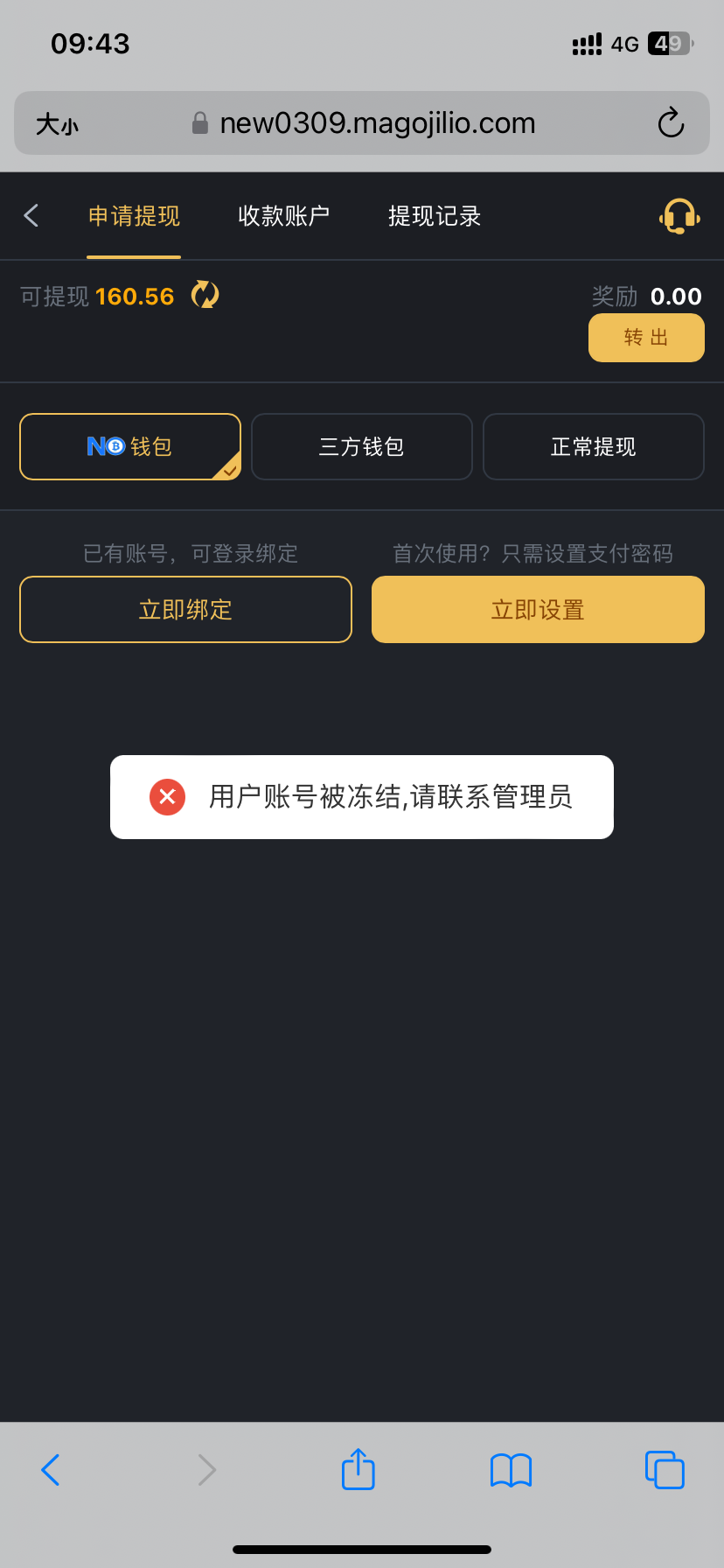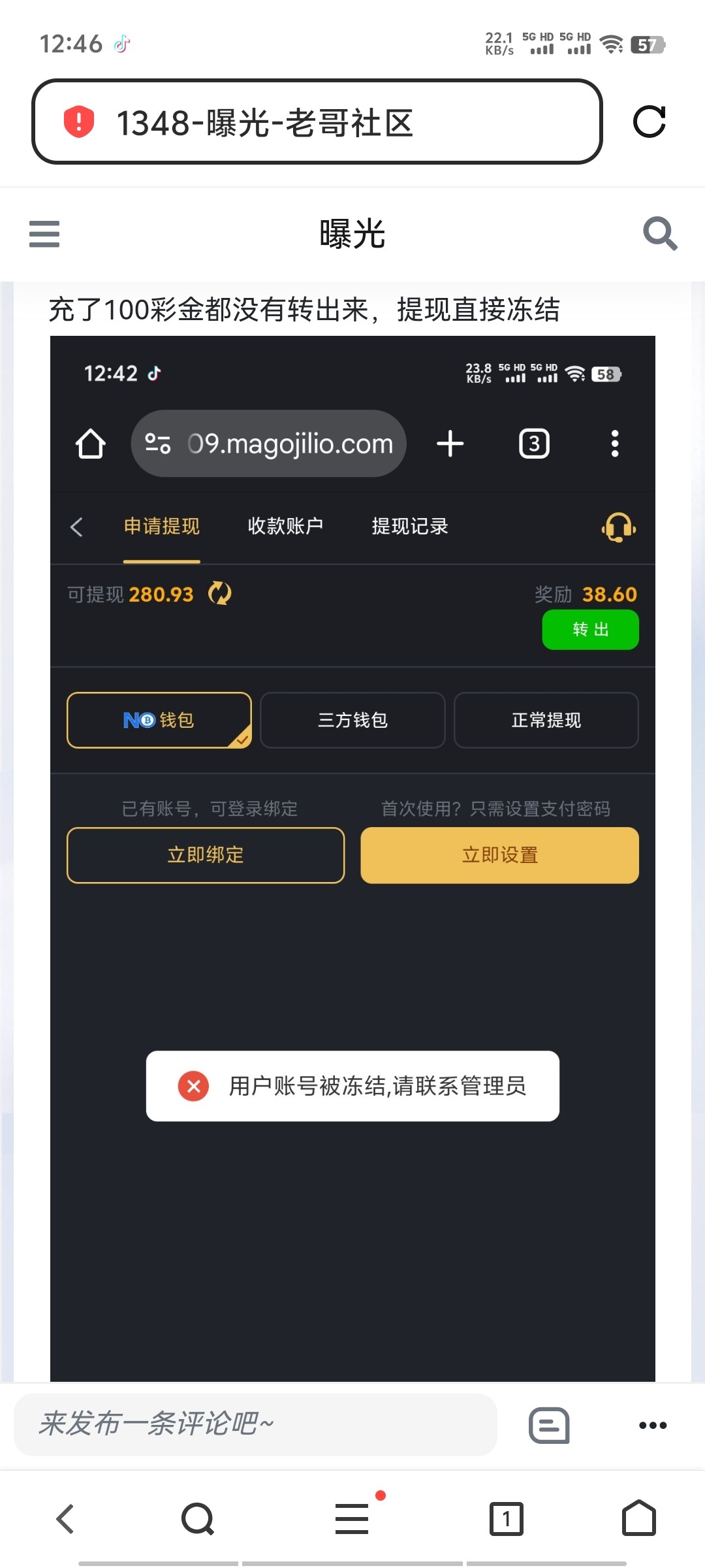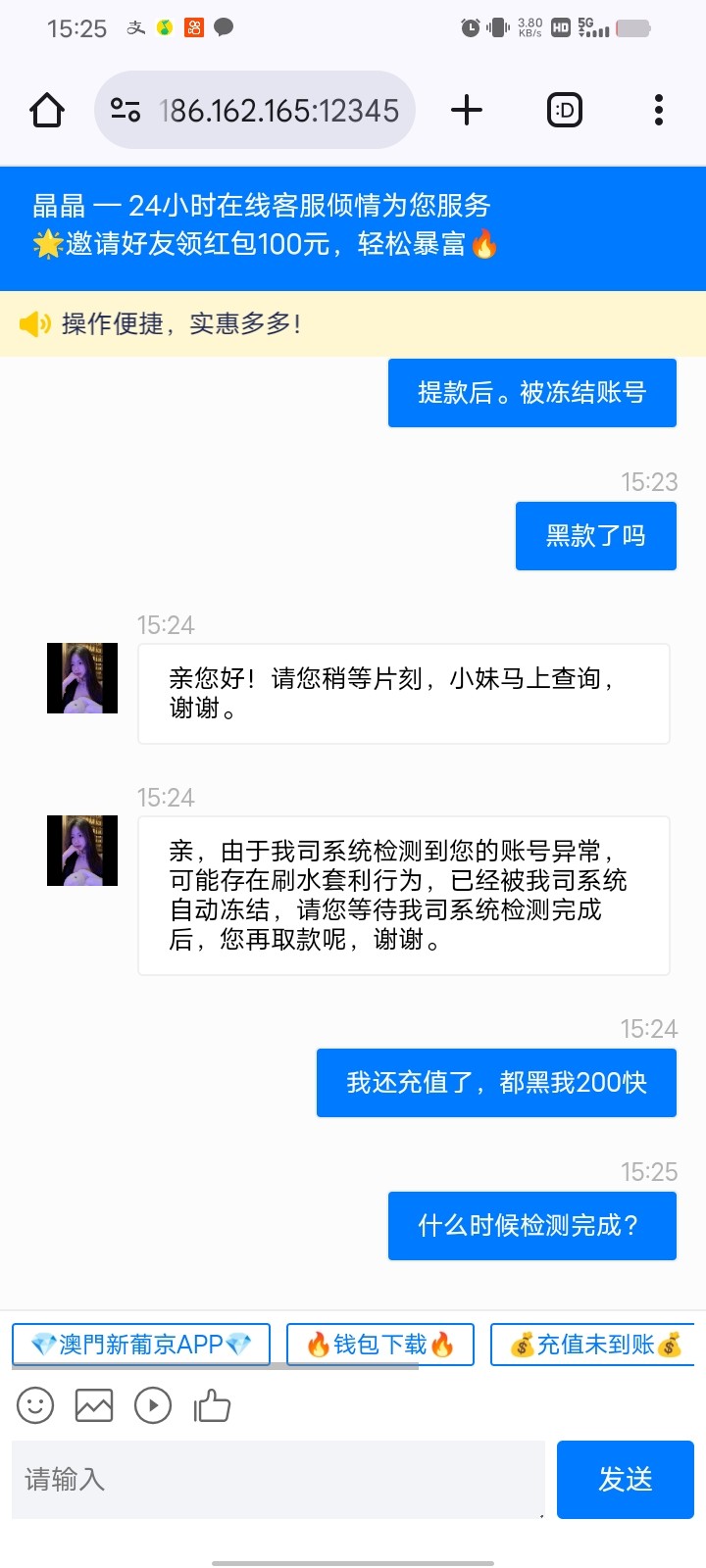 黑台一个一共充100大了半天赢了280提现直接冻结,彩金都没有转出来