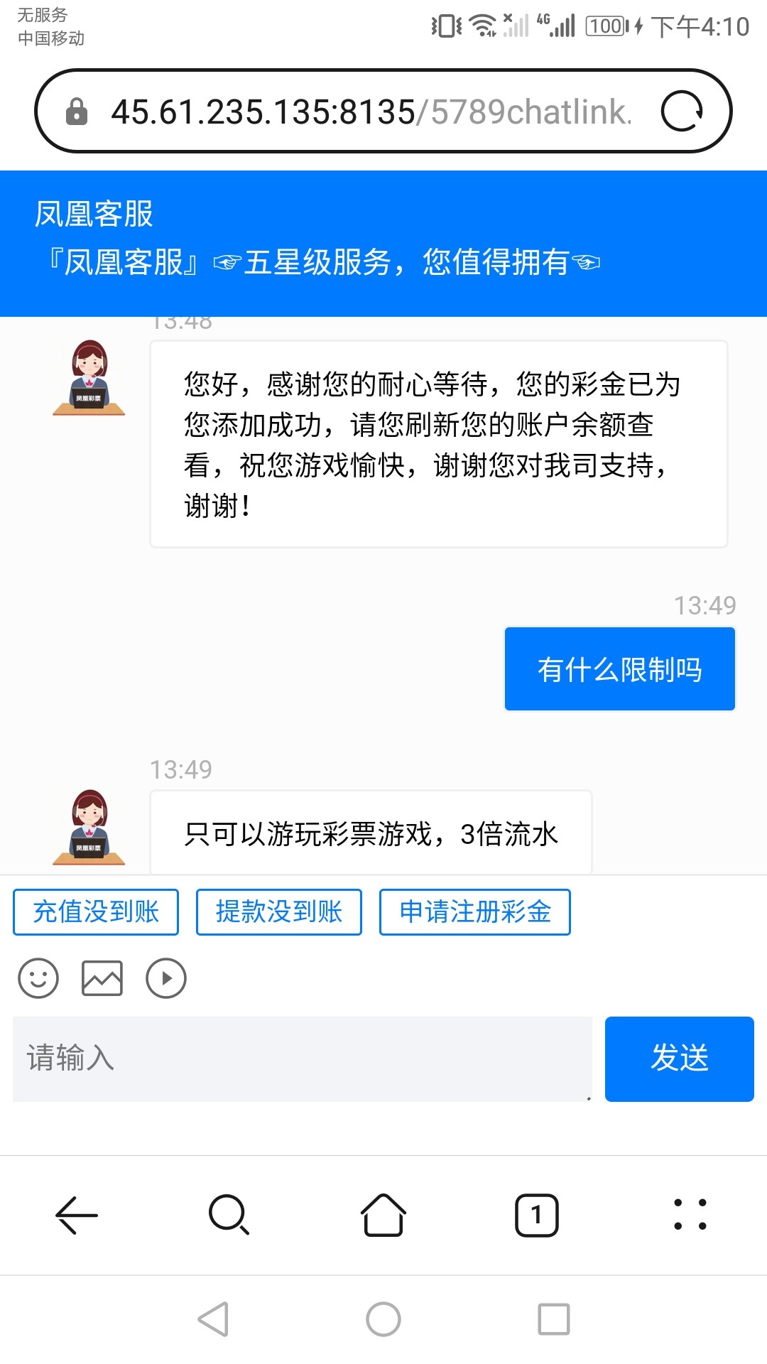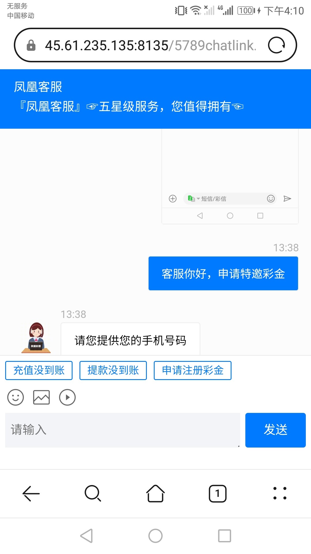凰彩票客服4:55 PM您好,查询不符合!没给您发过短信,嫖网看到帖子来申请的都无法派送!
