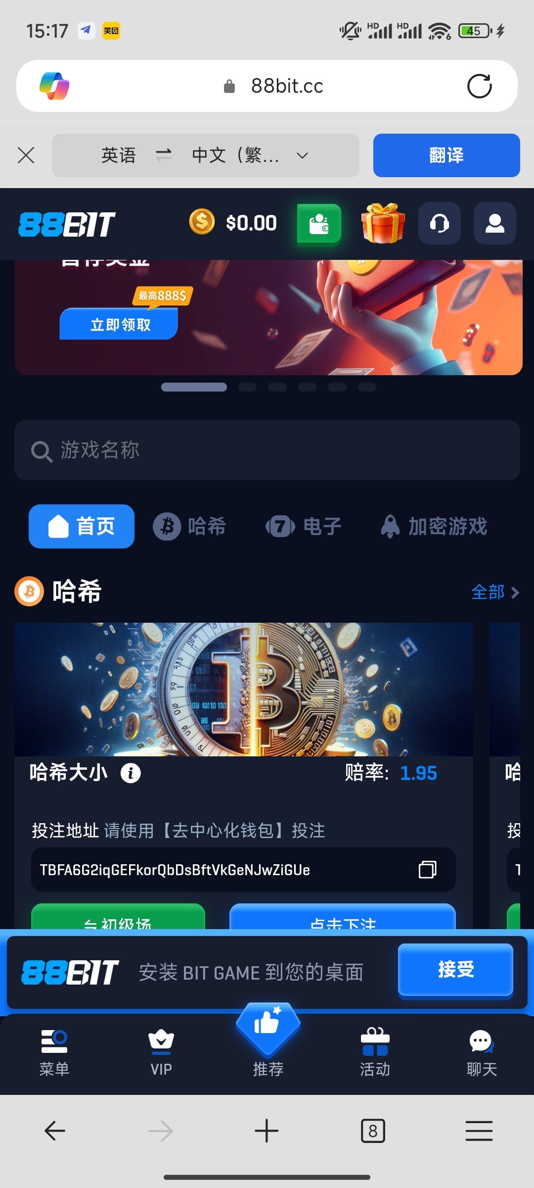 注册秒5u 彩金十倍水不限制,地址 88bit.cc 要开加速器进入