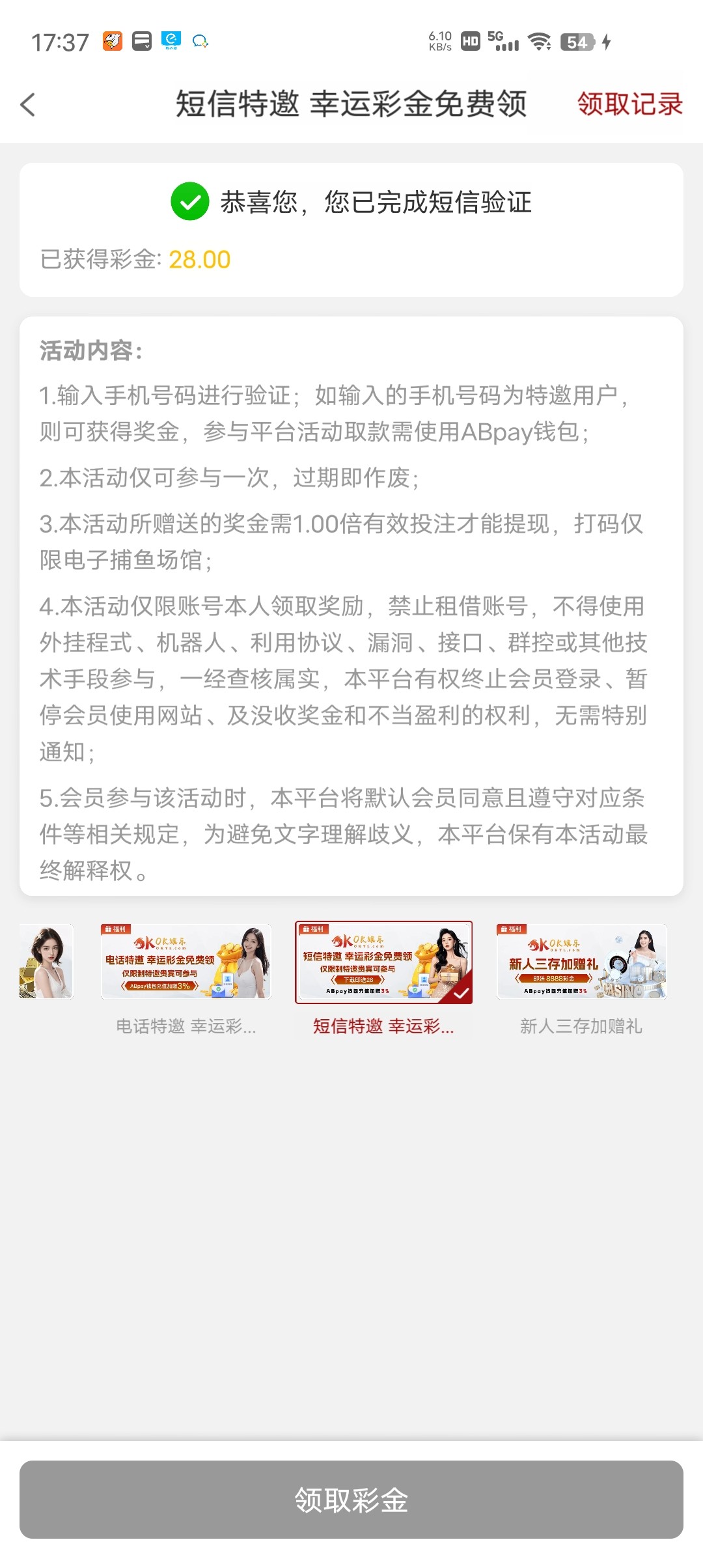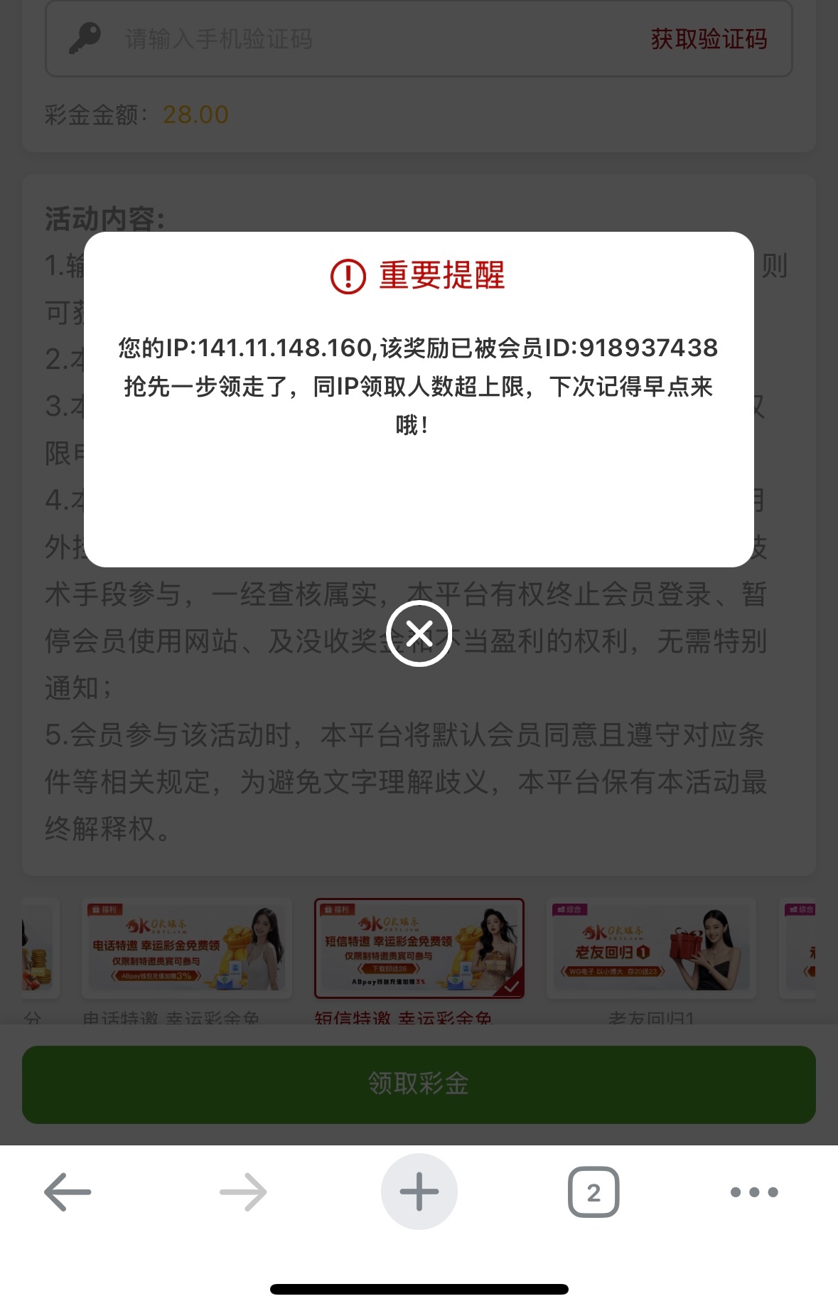 怎么两个电话彩金短信彩金还没领?