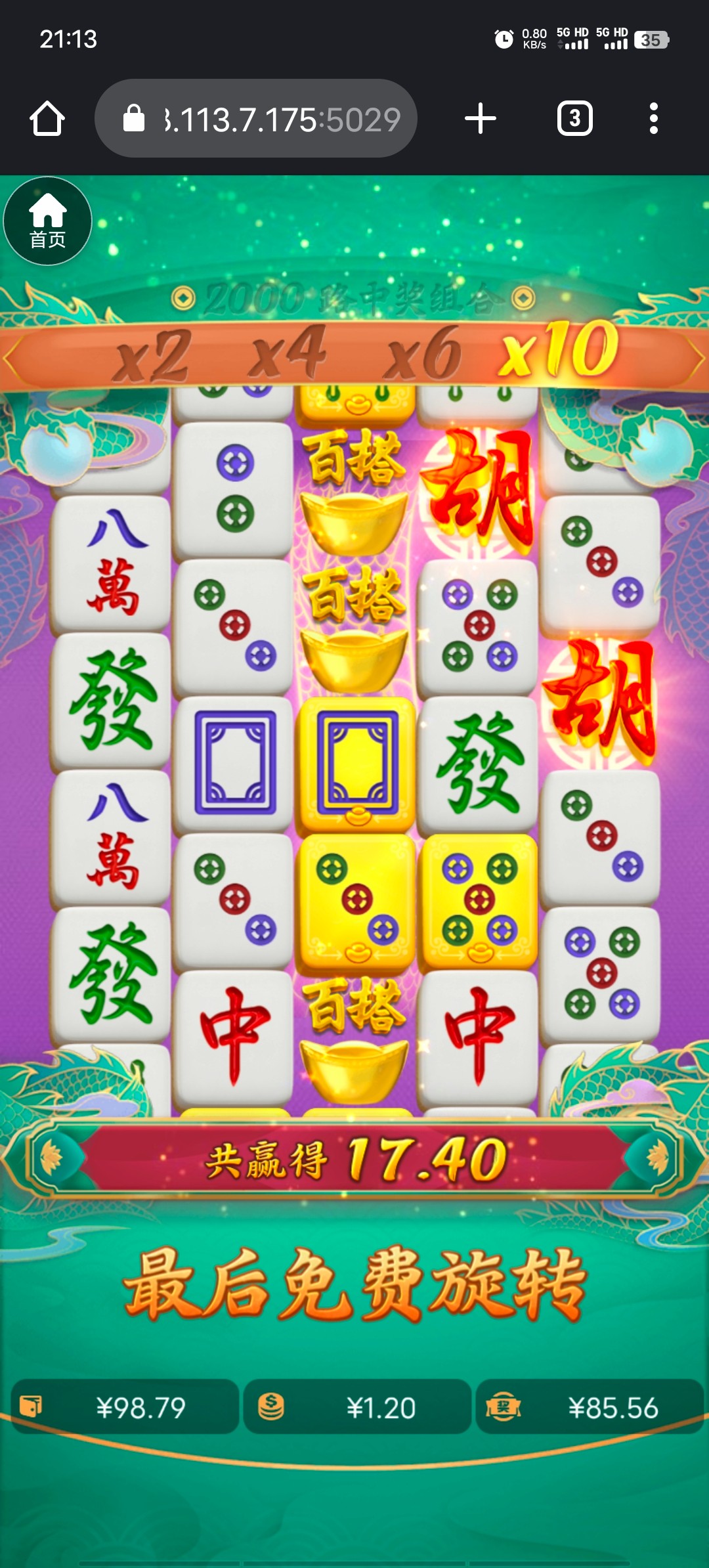 两个号出了一个,买彩票上 95 了,然后连挂 3 把,剩 30果断跑去麻将一