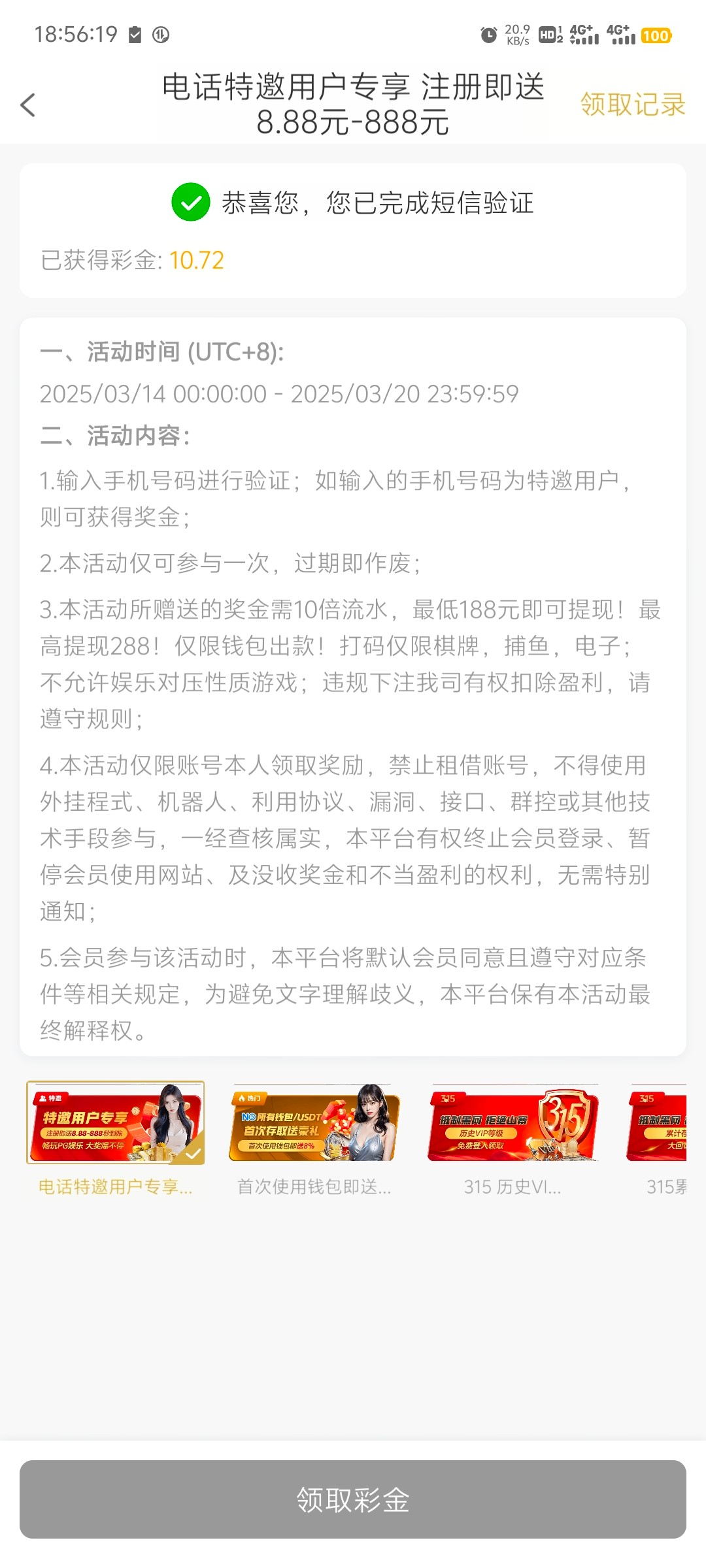 接到机器人电话,验证手机号领了10.72,麻1有水慢慢磨到313出了288 。可以碰瓷,勿充值!!! 100pg.com