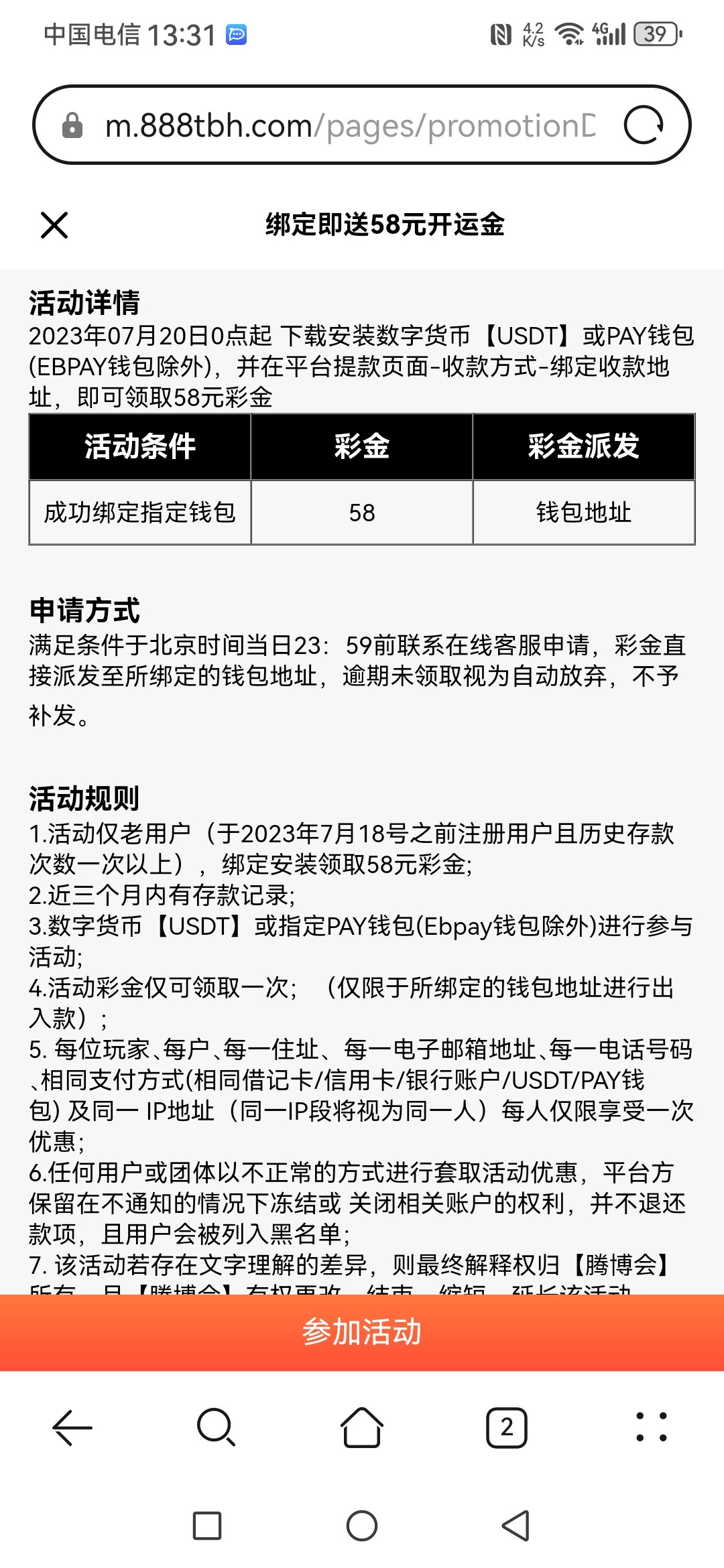 地址https://m.888tbh.com前几天打了一个100+88出了500,今天没事上去看下有没有活动,就申请了,几分钟就到58