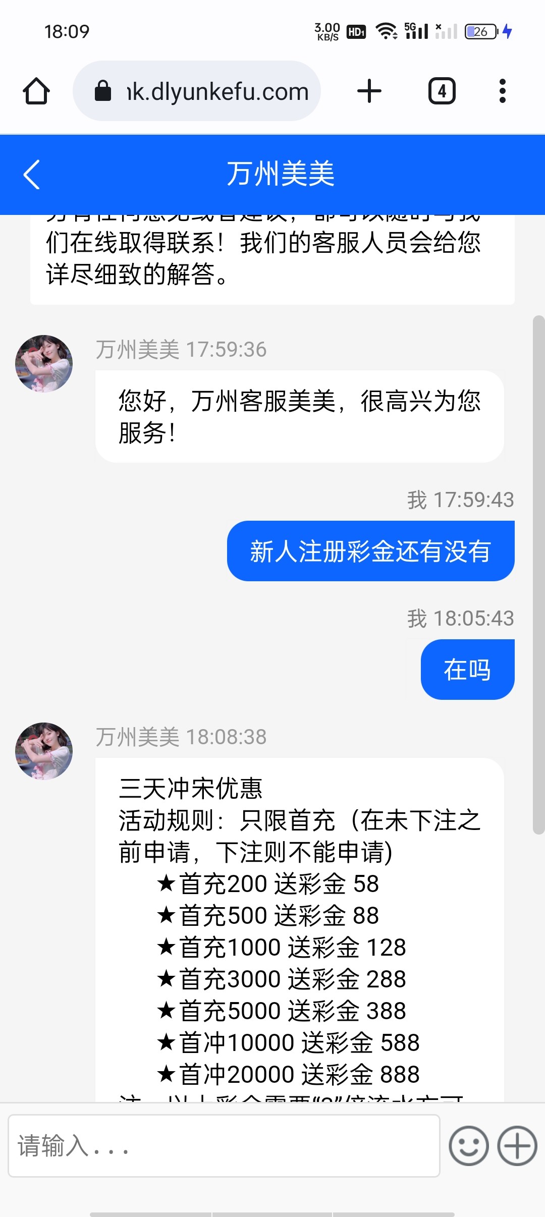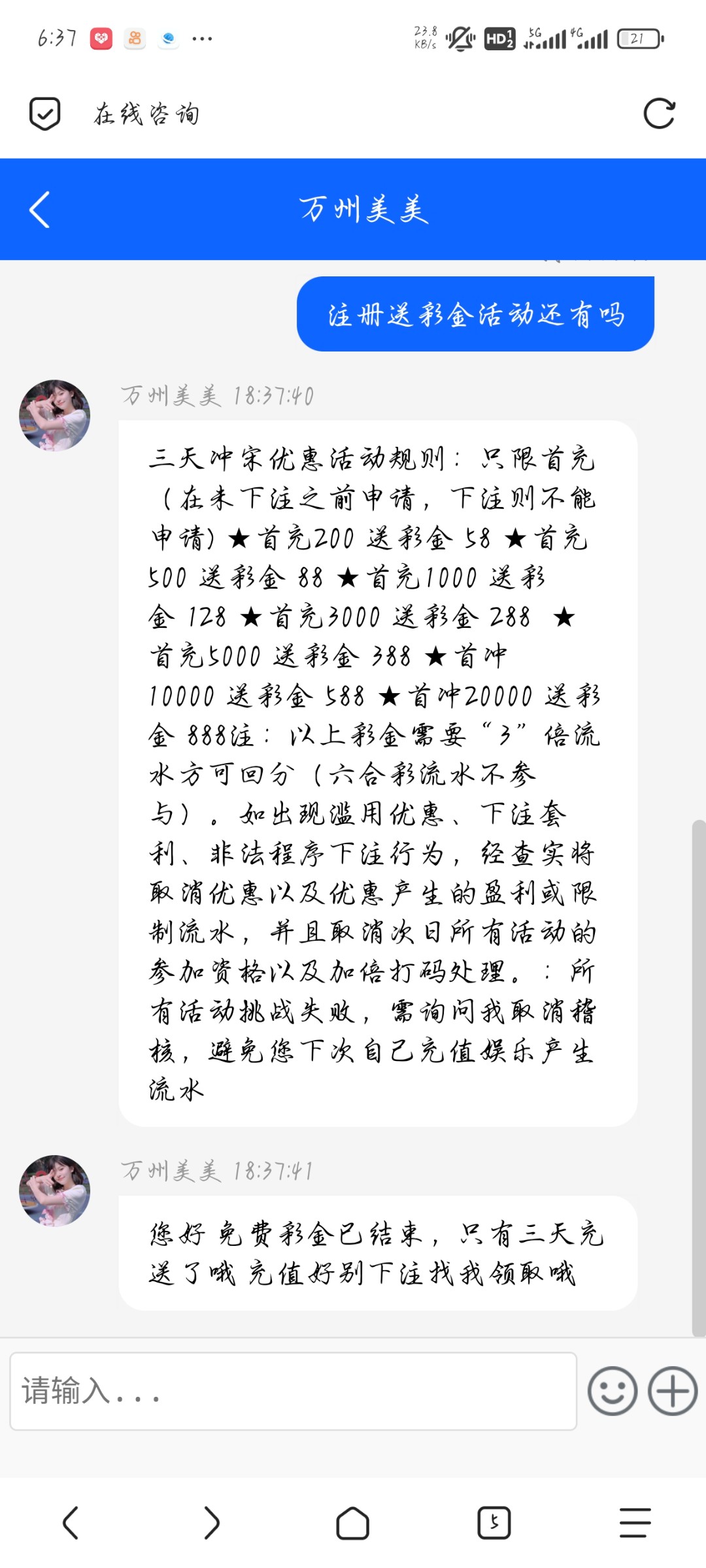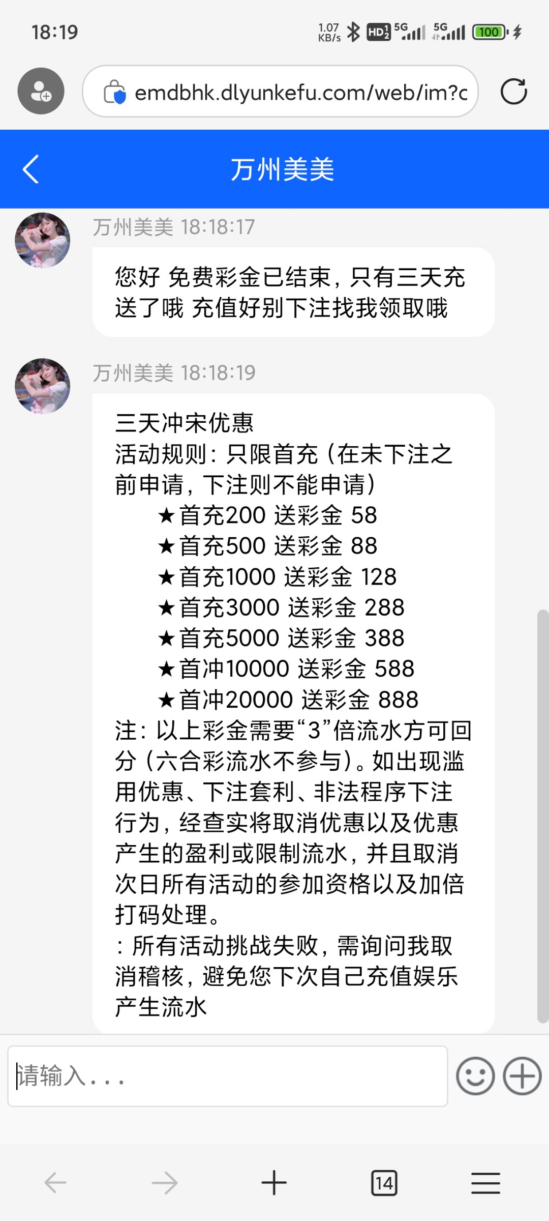 万州美美查看更多消息欢迎光临!您已经进入服务队列,大概需要等待10秒。如果您对我们的产品或者服务有任何意见或者建议,都可以随时与我们在线取得联系!我们的客服人员会给您详尽细致的解答。万州美美 18:13:49您好,万州客服美美,很高兴为您服务!我 18:14:04申请注册送彩活动万州美美 18:16:09三天冲宋优惠活动规则:只限首充(在未下注之前申请,下注则不能申请) ★首充200 送彩金 58 ★首充500 送彩金 88 ★首充1000 送彩金 128 ★首充3000 送彩金 288 ★首充5000 送彩金 388 ★首冲10000 送彩金 588 ★首冲20000 送彩金 888注:以上彩金需要“3”倍流水方可回分(六合彩流水不参与)。如出现滥用优惠、下注套利、非法程序下注行为,经查实将取消优惠以及优惠产生的盈利或限制流水,并且取消次日所有活动的参加资格以及加倍打码处理。:所有活动挑战失败,需询问我取消稽核,避免您下次自己充值娱乐产生流水万州美美 18:16:10您好 充值好别下注找我领取哦