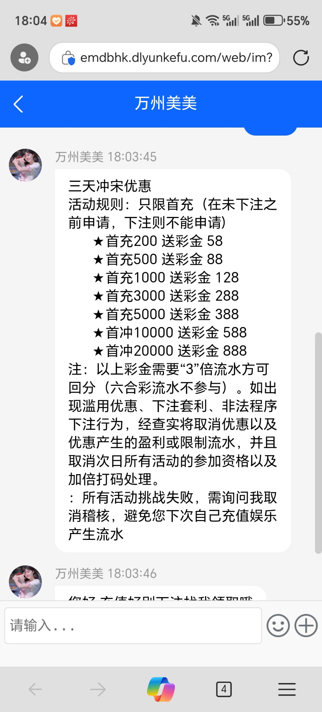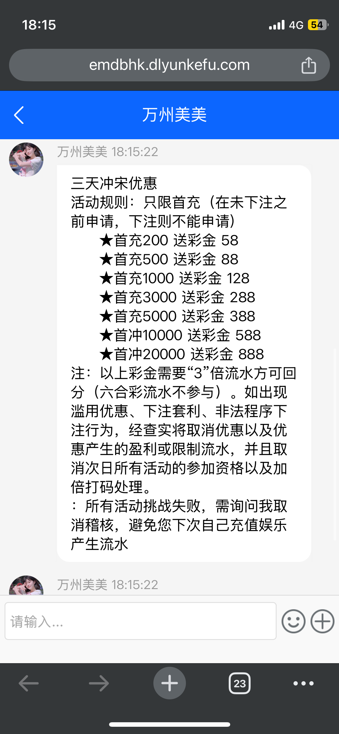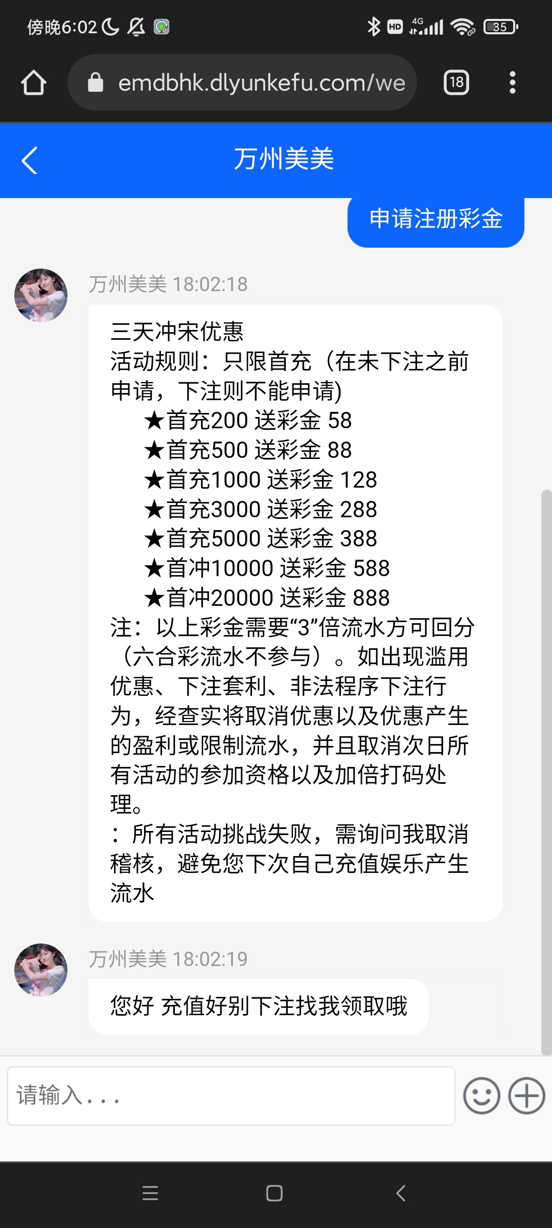 万州美美查看更多消息欢迎光临!您已经进入服务队列,大概需要等待10秒。如果您对我们的产品或者服务有任何意见或者建议,都可以随时与我们在线取得联系!我们的客服人员会给您详尽细致的解答。万州美美 18:13:49您好,万州客服美美,很高兴为您服务!我 18:14:04申请注册送彩活动万州美美 18:16:09三天冲宋优惠活动规则:只限首充(在未下注之前申请,下注则不能申请) ★首充200 送彩金 58 ★首充500 送彩金 88 ★首充1000 送彩金 128 ★首充3000 送彩金 288 ★首充5000 送彩金 388 ★首冲10000 送彩金 588 ★首冲20000 送彩金 888注:以上彩金需要“3”倍流水方可回分(六合彩流水不参与)。如出现滥用优惠、下注套利、非法程序下注行为,经查实将取消优惠以及优惠产生的盈利或限制流水,并且取消次日所有活动的参加资格以及加倍打码处理。:所有活动挑战失败,需询问我取消稽核,避免您下次自己充值娱乐产生流水万州美美 18:16:10您好 充值好别下注找我领取哦