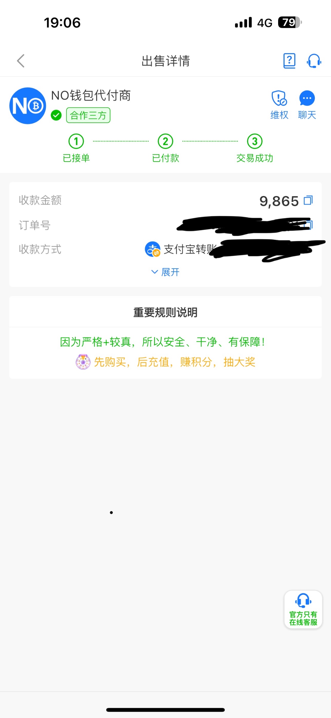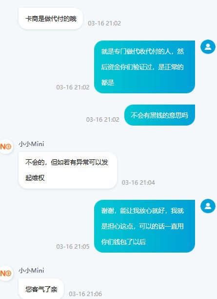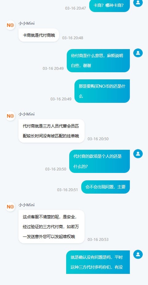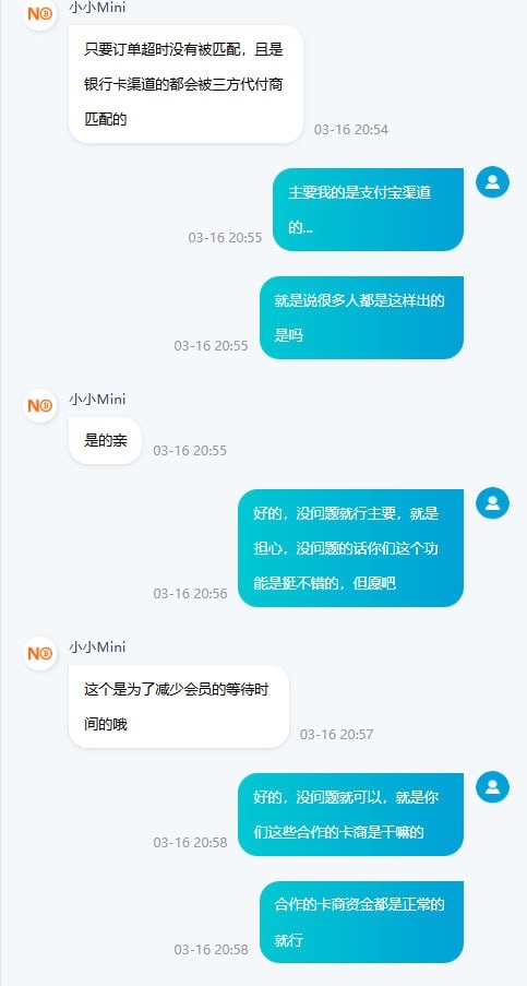 事情是这样的,我提现五个到NO钱包,开始断断续续卖了小一万,然后剩余卖币卖了三天,第三天的时候突然弹出NO钱包第三方合作商接单了,然后支付宝慢慢就有人转钱,钱就到账了,到账后还是自动放币的,有点迷之操作,三方合作商估计是狗庄吧,就是有点担心资金问题,问NO钱包客服说不会有资金问题,似乎有点高级了...