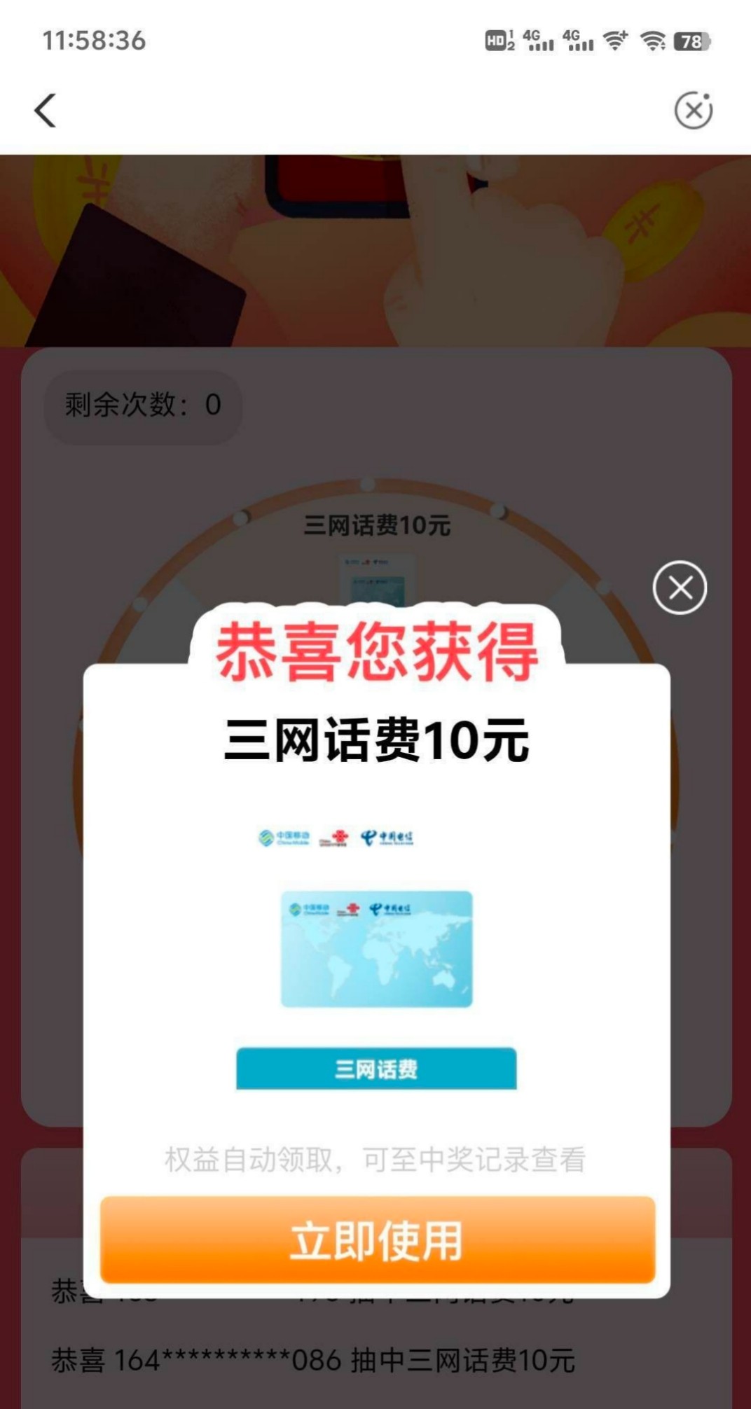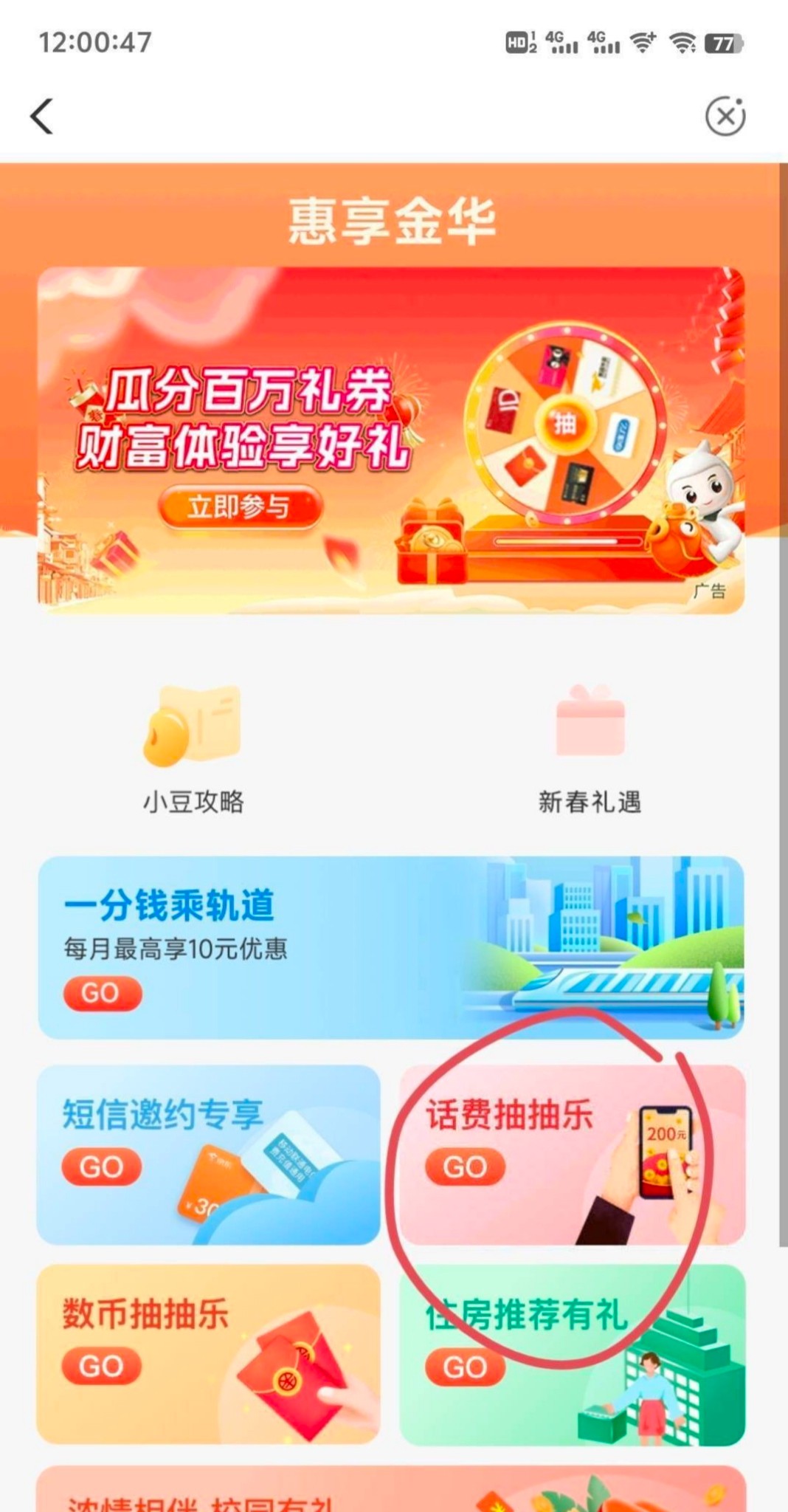 ②农行。金华城市专区,惠享金华,下面话费抽抽乐,不用飞