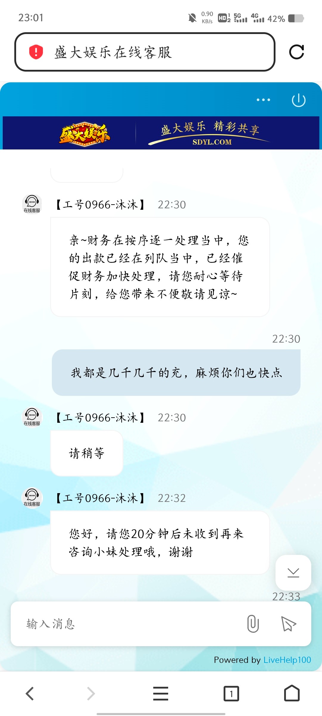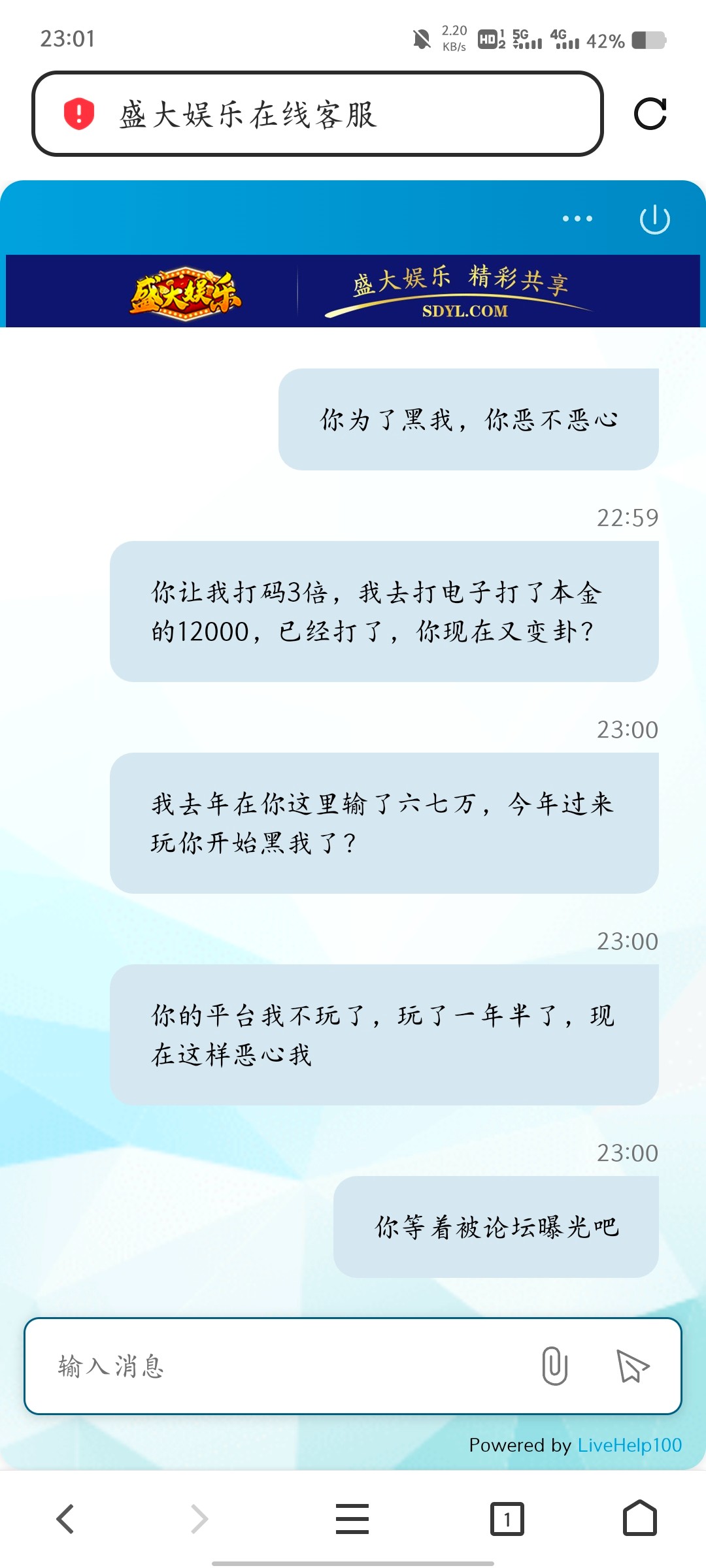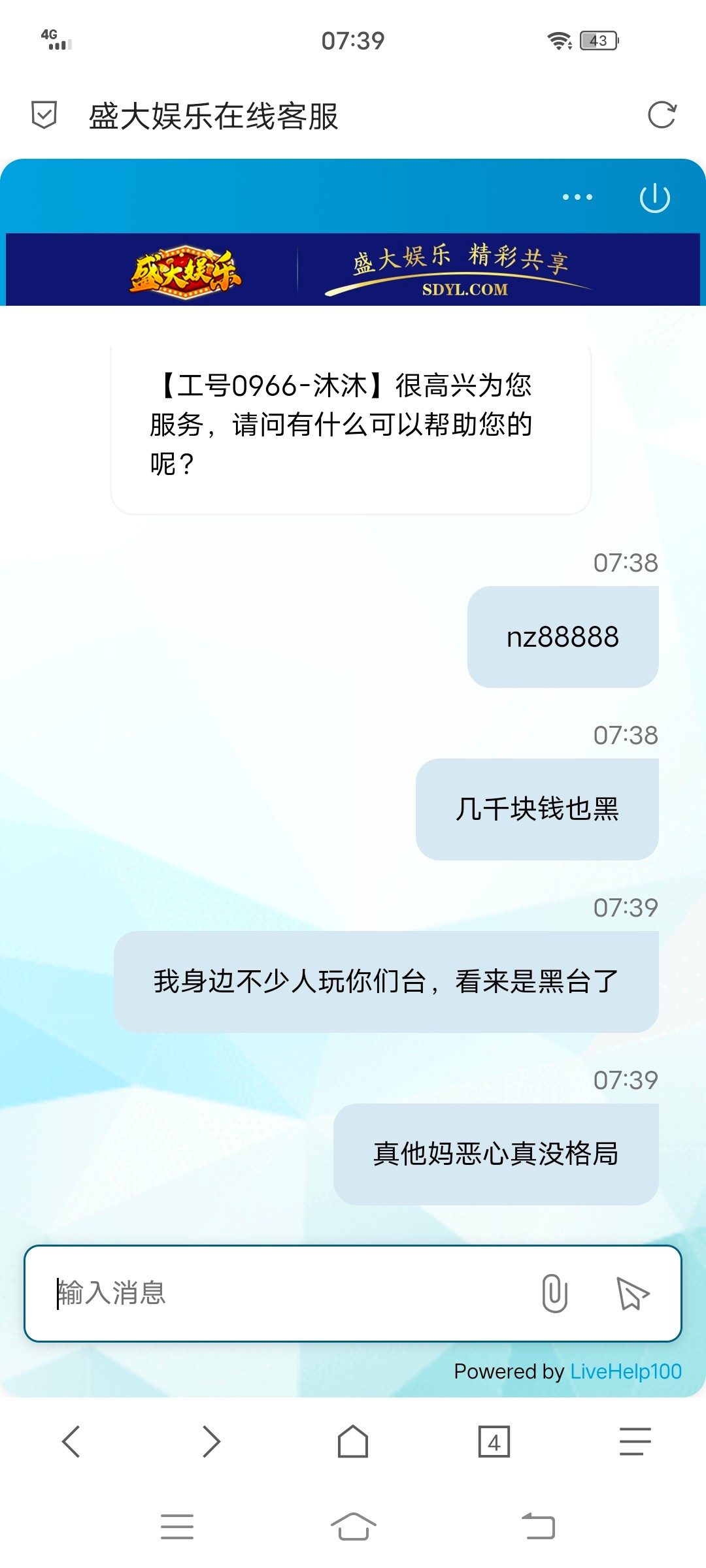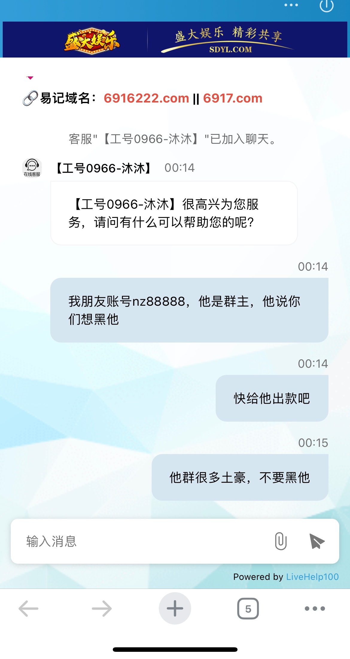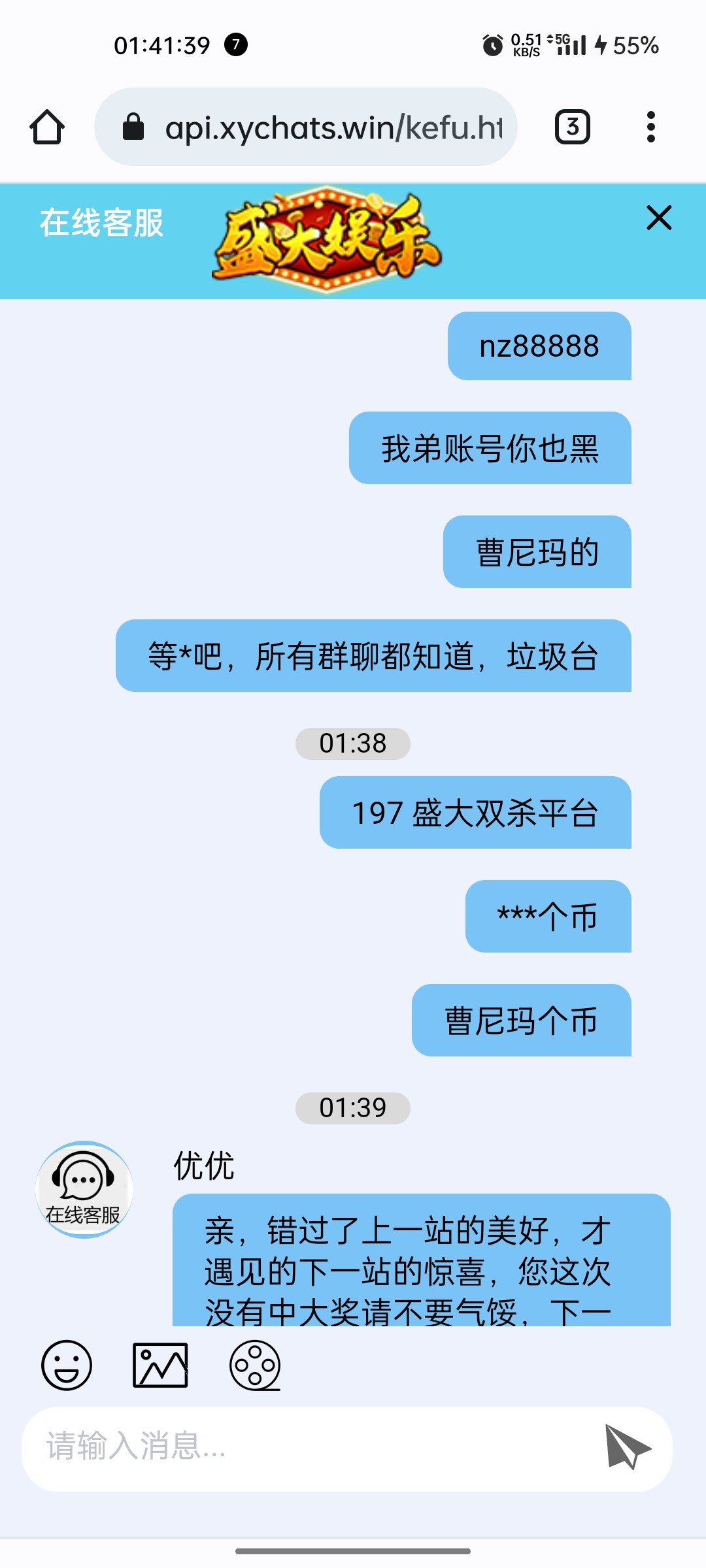 事情是这样,我在论坛求助老哥们卖to,然后去盛大充to打真人,都是正常打,有时候压庄,有时候压闲,第一次充值1000上4000,提现说我低流水,说给我一次机会,我提了,第二次充了3000,打了1.5万流水,提了3000,第三次充4000输完了,第四次充4000,打了1.2万流水打到5000,然后提现说我低投注,必须娱乐电子捕鱼棋牌三倍流水,我打了13000,打到7000,然后提现,让我等待出款,过了半小时不回复,然后突然回复,继续让我重新打码5倍流水,现在估计是被黑了,这个平台玩了一年多了,24年输了六七万,今年这样来恶心我,麻烦老哥们去问候一下这个客服,我账号nz88888,都去骂一下这脑瘫黑台客服,要是能骂提现成功了,我团to刚好里面还有一点,如果确定是黑了,你们帮忙骂的,我会记着,后面我发贴子,留to地址,我随机团,谢谢各位,第一次被黑!