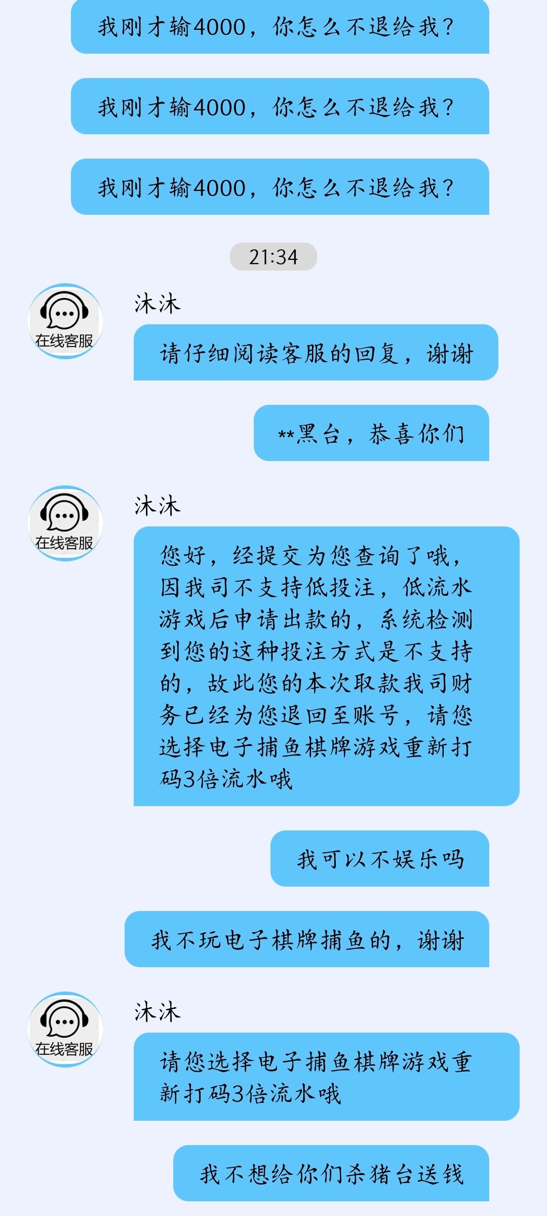 你第3次4000输了,估计没多少流水,加上第4次,相当于充值8000x6,那要5w流水出,很多平台都这样,赢钱了就多打流水,反正是赢的钱,长点心吧。