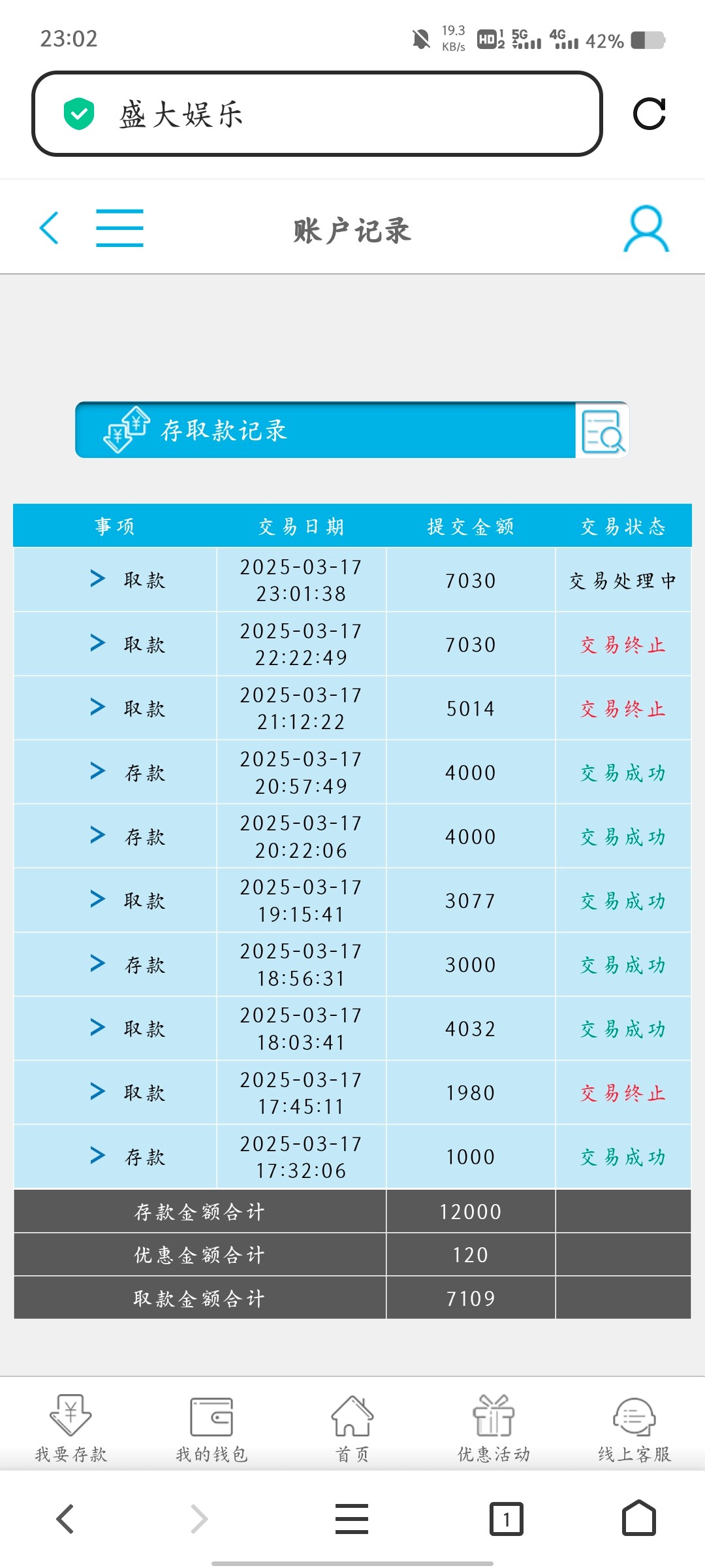 你这种存法,盛大肯定罚你流水  每次都和存款差不多的额度提款。  存3000取3000多存8000取7000多。。。