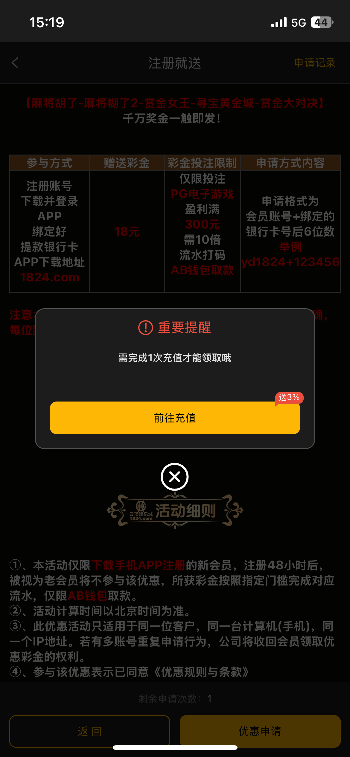 需要充值一次才能申请你是一字不说。!
