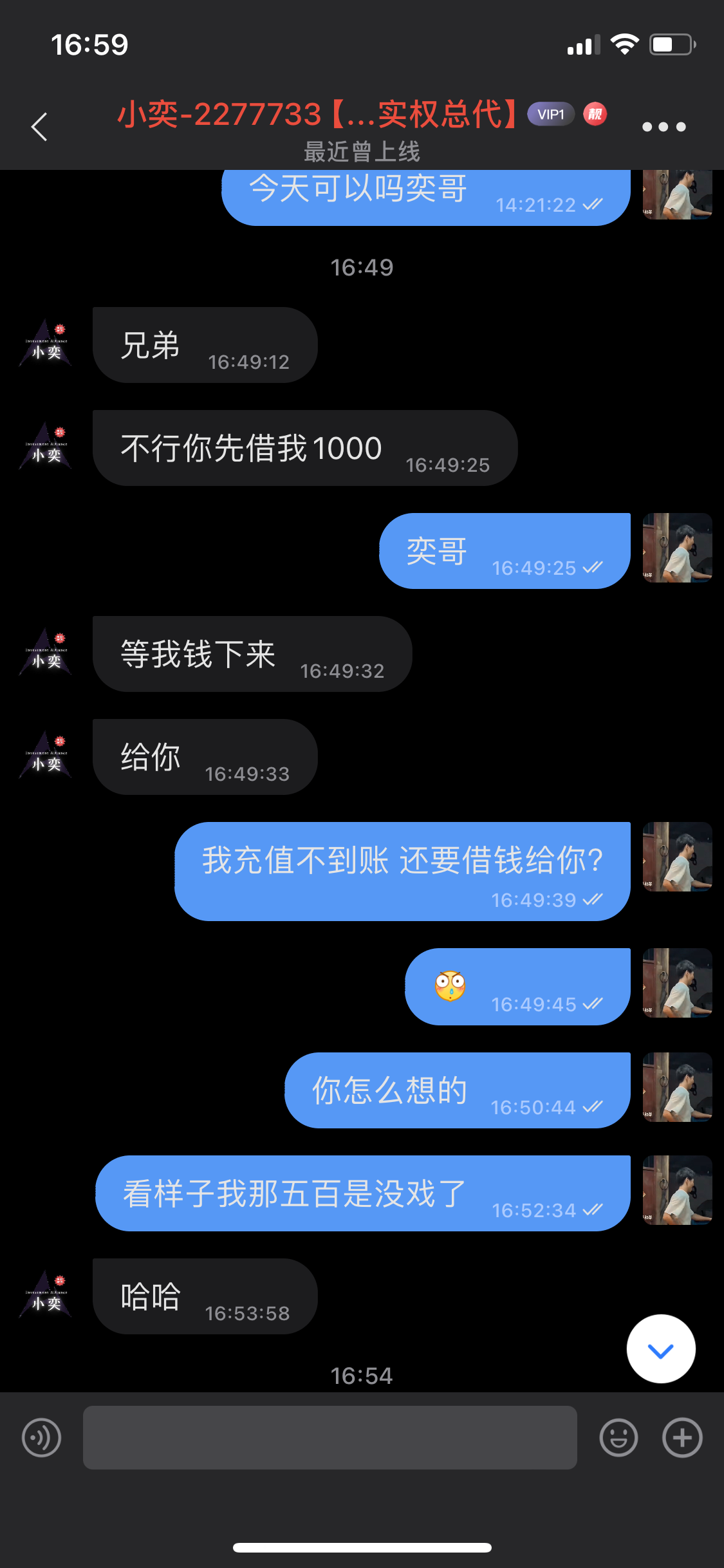 这杂种代理我充值五百不到账四五天了 她说赔我结果又找我借钱 还说到睡时候给我 存存杂种一个还在玩的兄弟趁早扯了吧