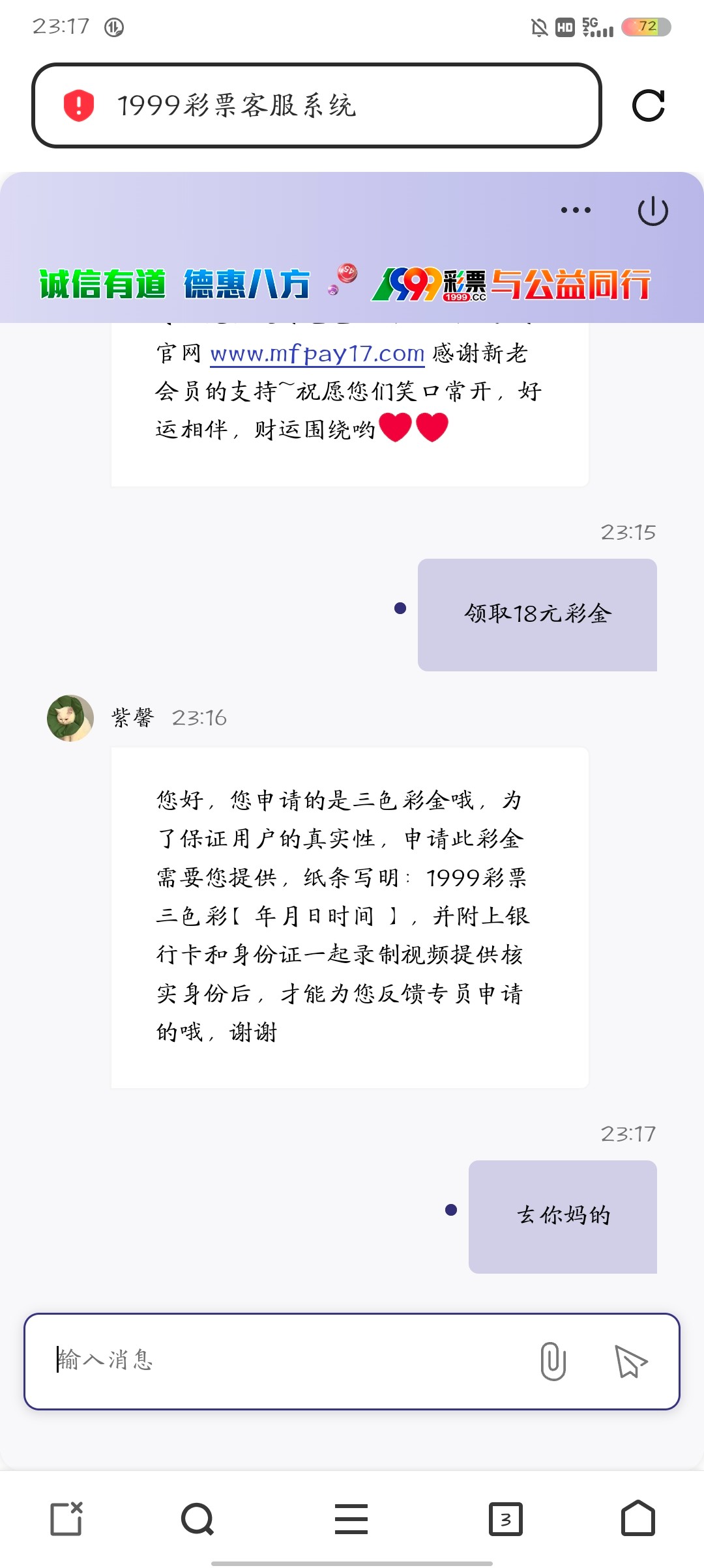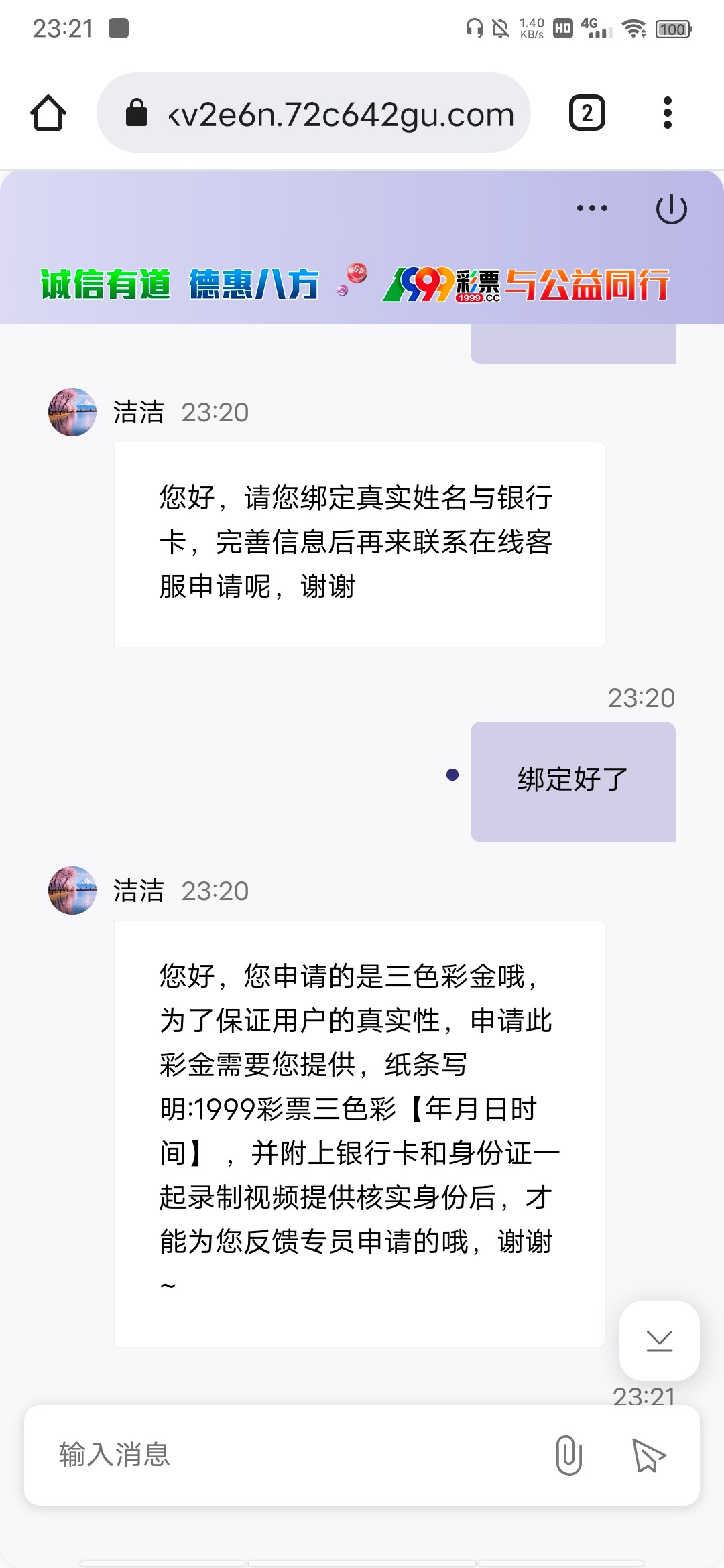 您好,您申请的是三色彩金哦,为了保证用户的真实性,申请此彩金需要您提供,纸条写明:1999彩票三色彩【年月日时间】 ,并附上银行卡和身份证一起录制视频提供核实身份后,才能为您反馈专员申请的哦,谢谢
