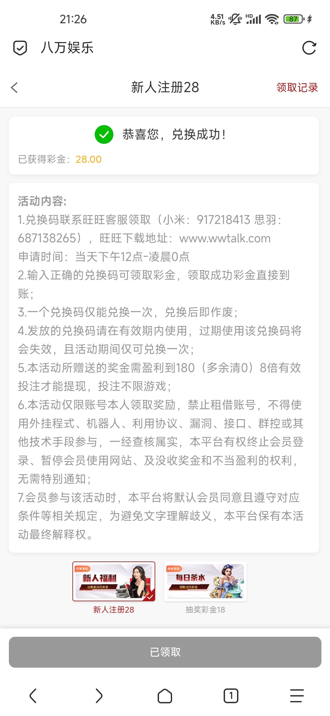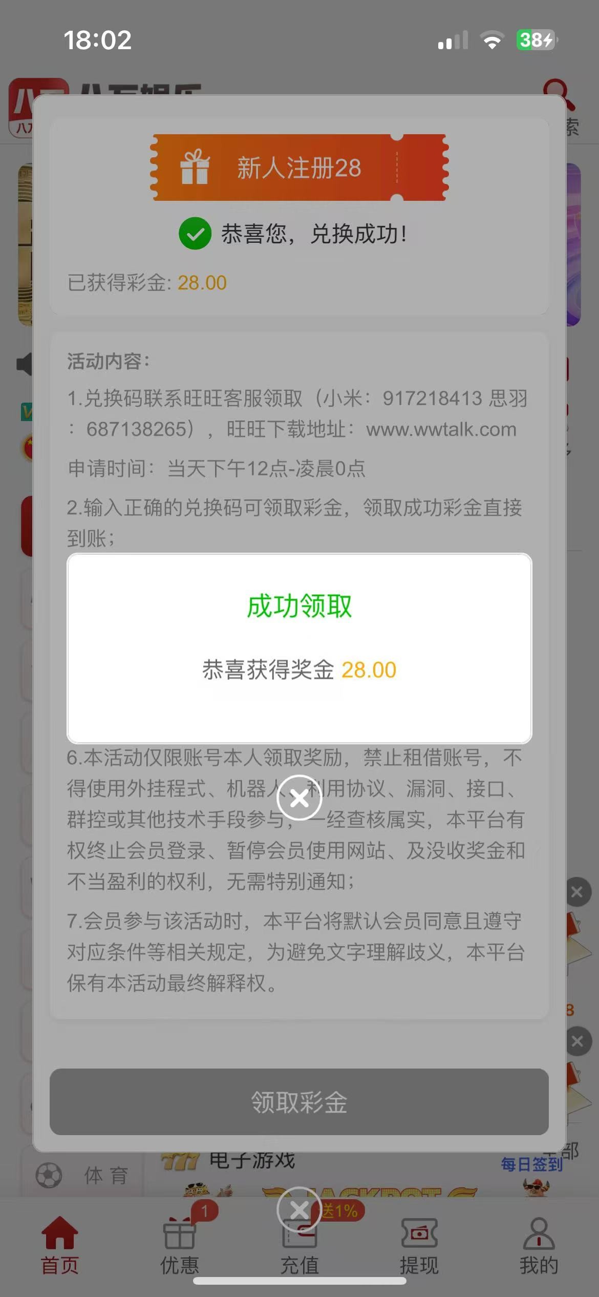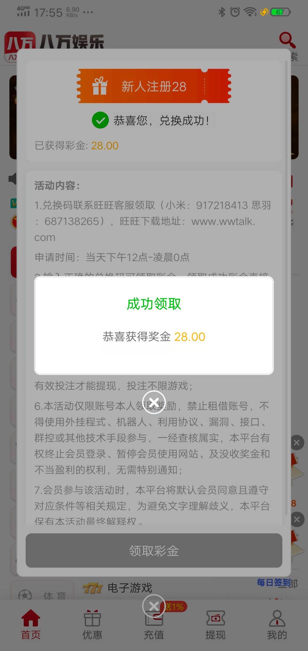 活动解除,但是可以打广告申请 我是送了 去玩AG电子一飞冲天 十分钟上了181 直接提了,五分钟左右秒到了