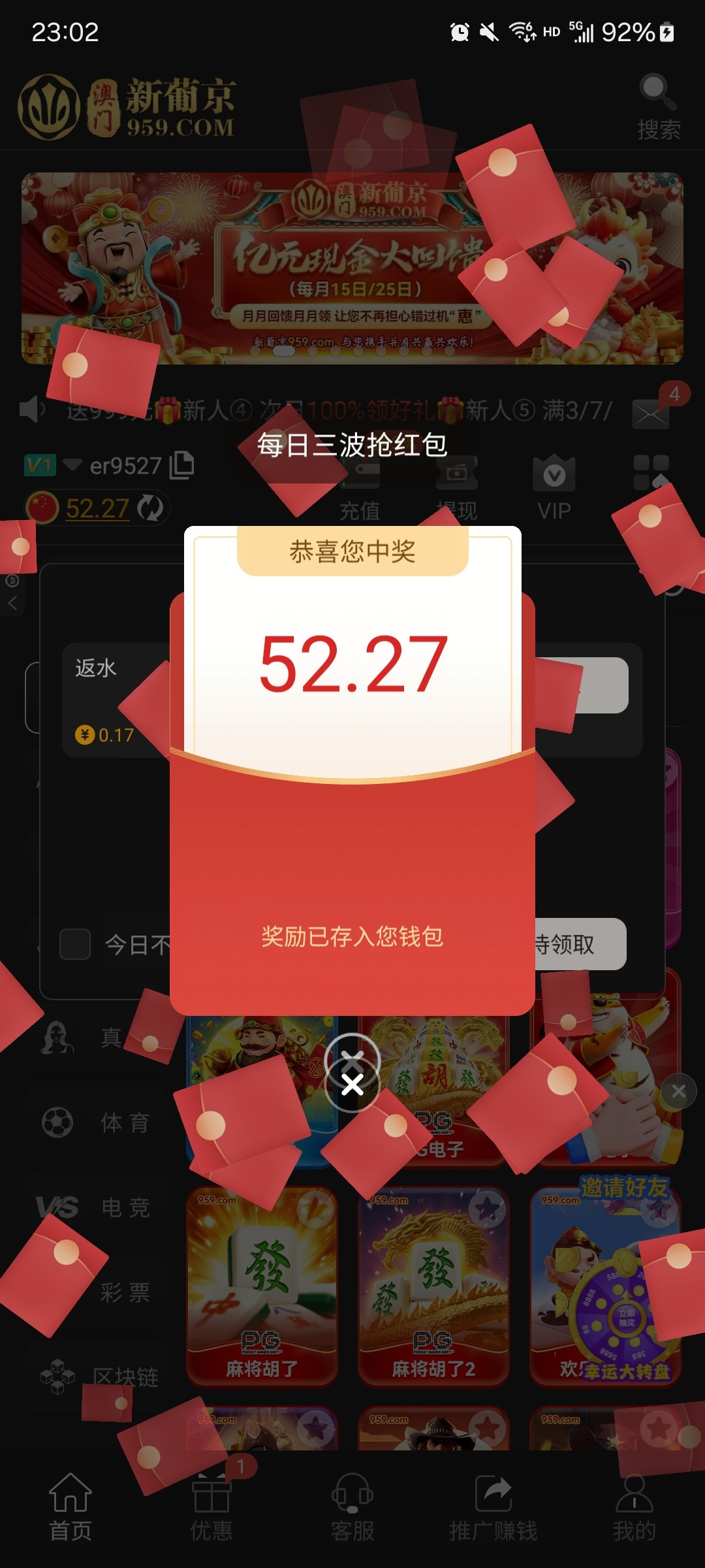 网址:959.com我是历史充值过200 神秘彩金是19 昨天看老哥发了神秘彩金是1.88 但是我没有 今天一看居然有19 有号的老哥可以去看看 充值或者没有充过的都去看看